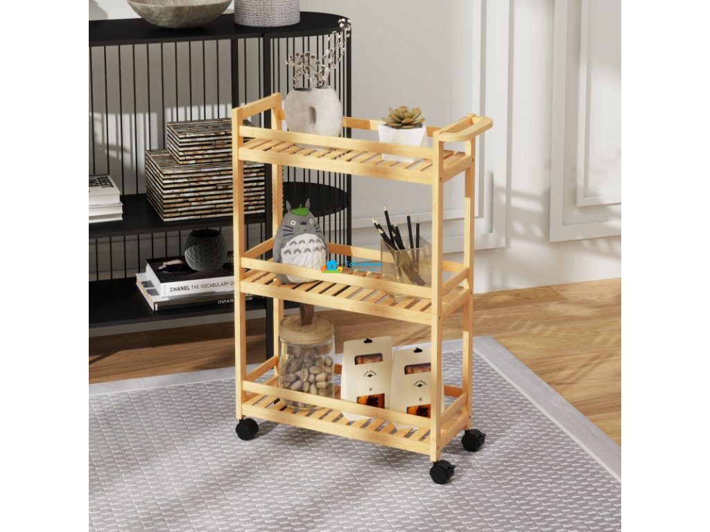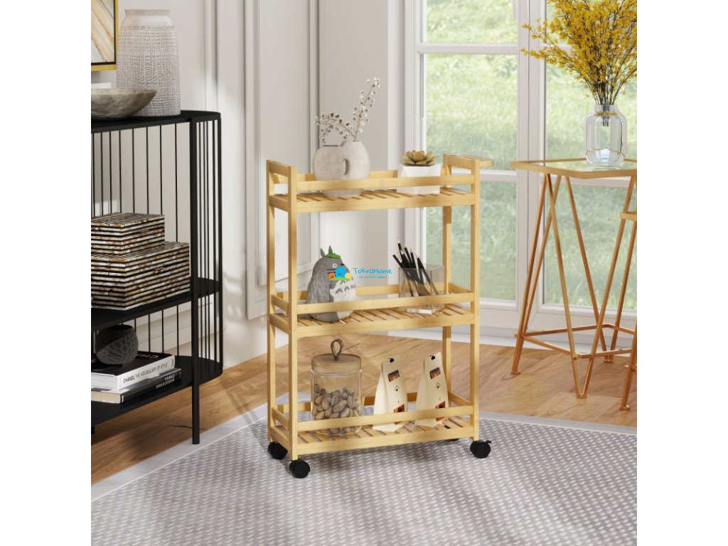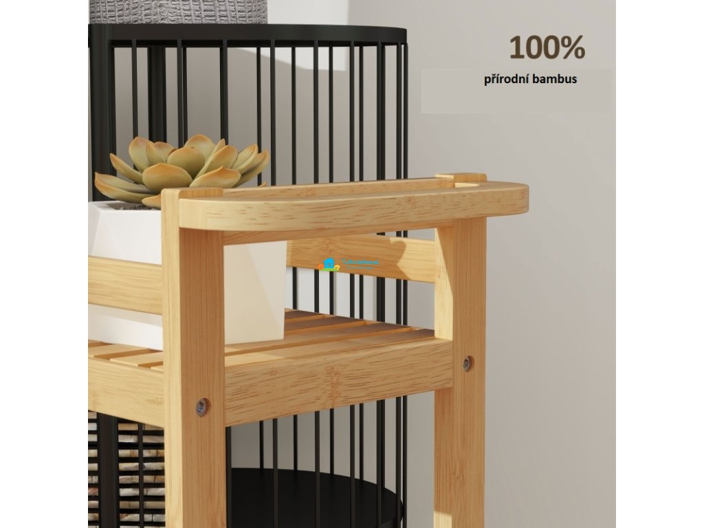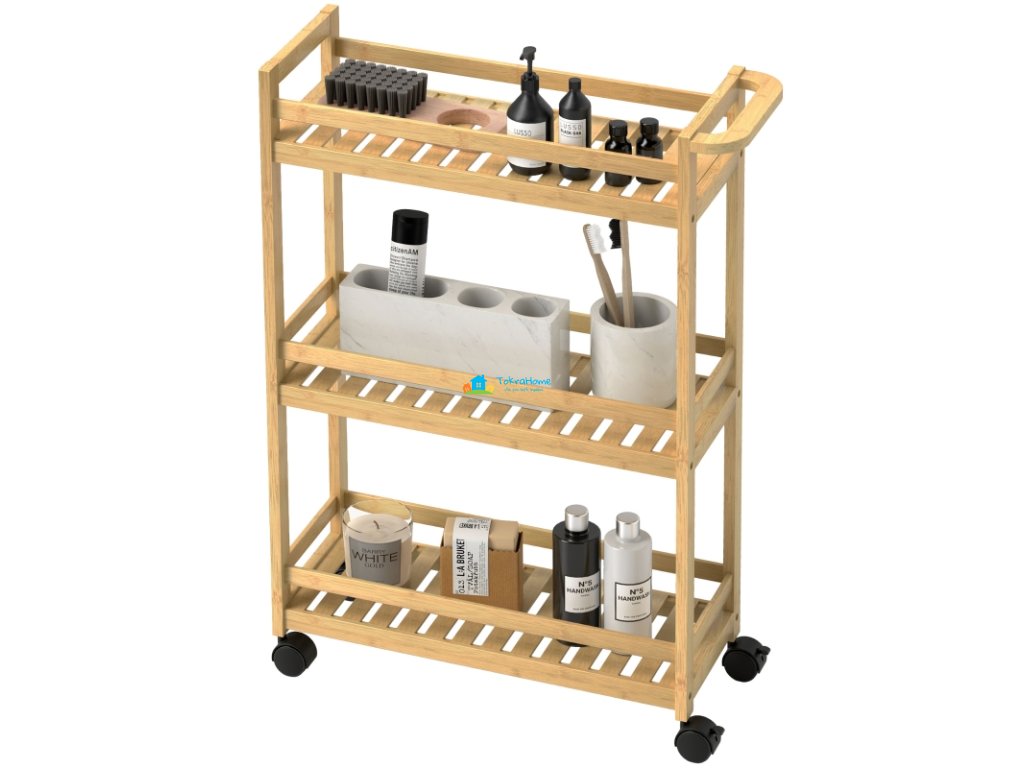 Praktický třípatrový pojízdný regál z kvalitního bambusu se hodí do kuchyně, koupelny i kanceláře. Lamelové police zajišťují cirkulaci vzduchu a chrání uložené věci před vlhkostí a plísní. Ochranné zábradlí na každé polici zabraňuje vypadnutí předmětů. Díky čtyřem kolečkům a madlu se snadno přesouvá, dvě kolečka mají brzdu pro bezpečné zajištění. Kompaktní rozměry umožňují využití i v úzkých prostorech, přičemž celková nosnost je až 12 kg.