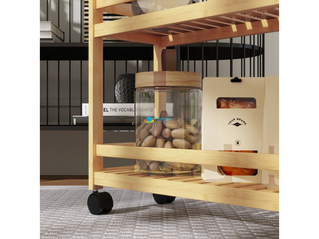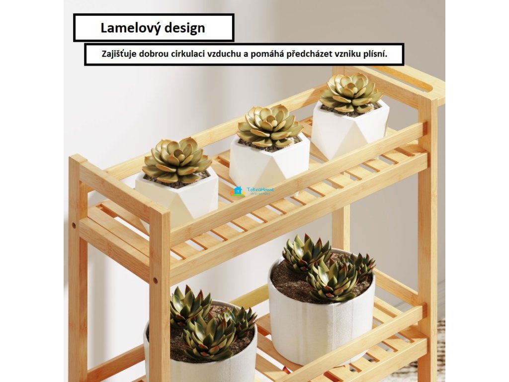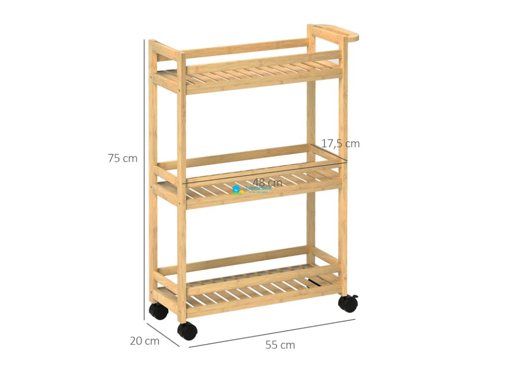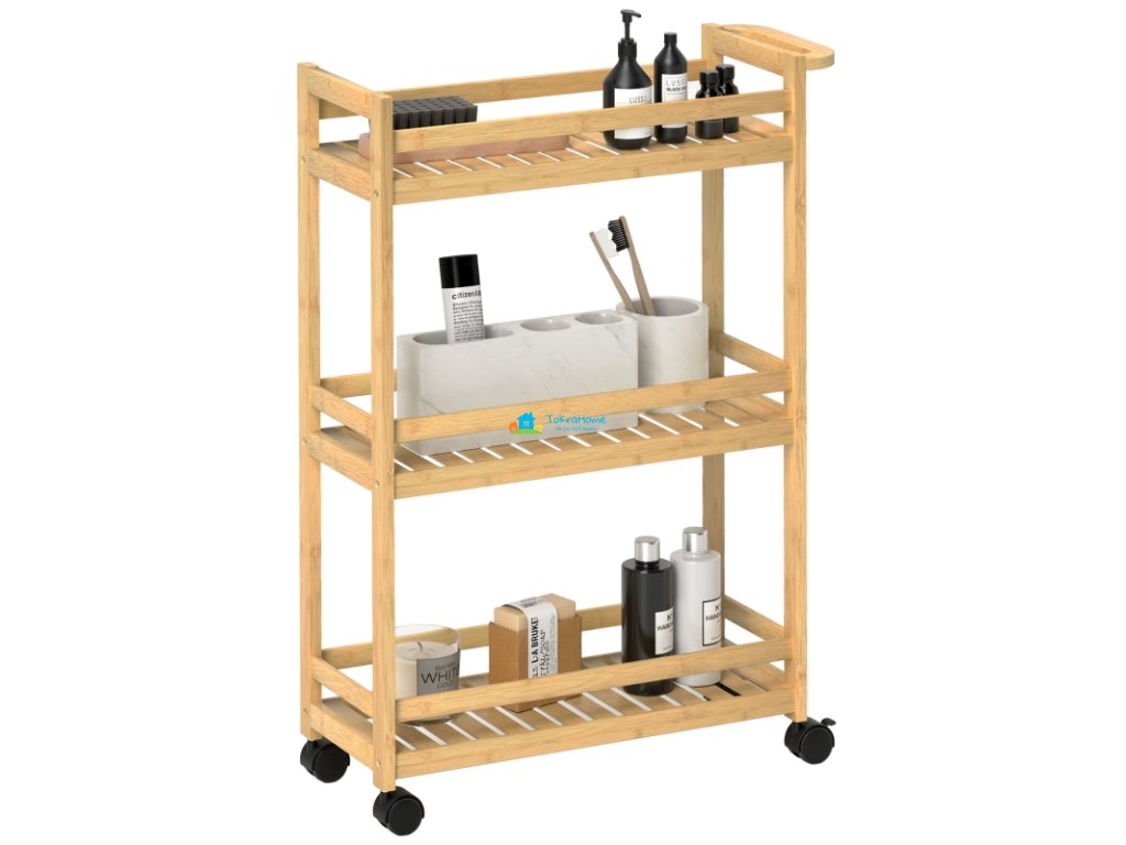 Praktický třípatrový pojízdný regál z kvalitního bambusu se hodí do kuchyně, koupelny i kanceláře. Lamelové police zajišťují cirkulaci vzduchu a chrání uložené věci před vlhkostí a plísní. Ochranné zábradlí na každé polici zabraňuje vypadnutí předmětů. Díky čtyřem kolečkům a madlu se snadno přesouvá, dvě kolečka mají brzdu pro bezpečné zajištění. Kompaktní rozměry umožňují využití i v úzkých prostorech, přičemž celková nosnost je až 12 kg.