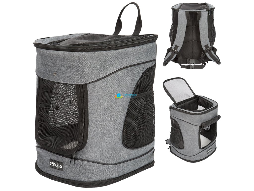 Batoh pro přepravu mazlíčků, otevíratelný shora i zepředu, 2 síťované kapsy, 3 síťované okna, polstrovaný, šedý