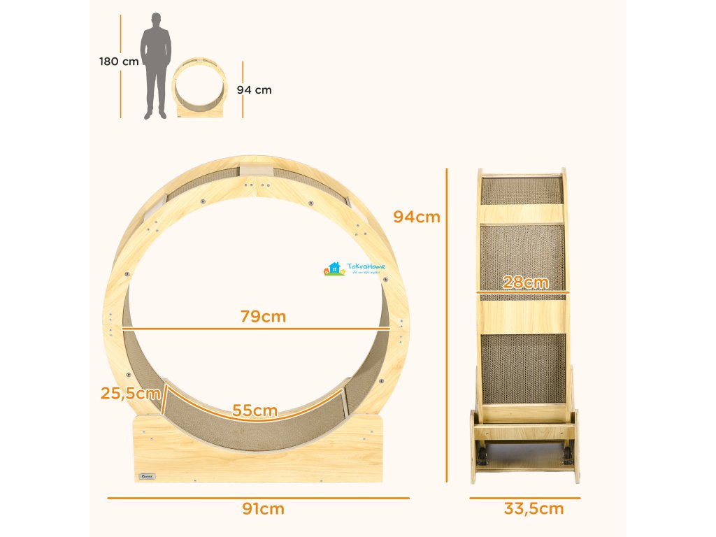 Údržba je velmi snadná, protože škrabací podložka lze jednoduše vyměnit za novou, když se opotřebuje. Kolo je vyrobeno z kvalitní vícevrstvé desky, oceli a odolné lepenky v elegantním přírodním provedení. S rozměry 91 × 33,5 × 94 cm je vhodné pro kočky do hmotnosti 5 kg a je dodáváno v rozloženém stavu, přičemž je nutná montáž. Běhací kolo je tak ideální řešení pro majitele menších koček, kteří chtějí svému mazlíčkovi dopřát více pohybu a zároveň ochránit nábytek před škrábáním.
