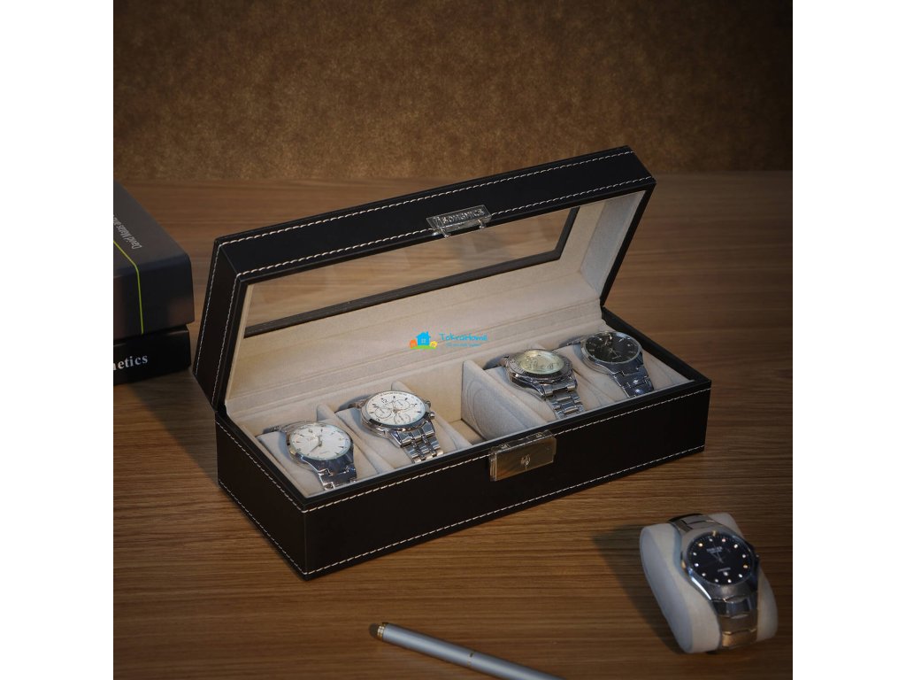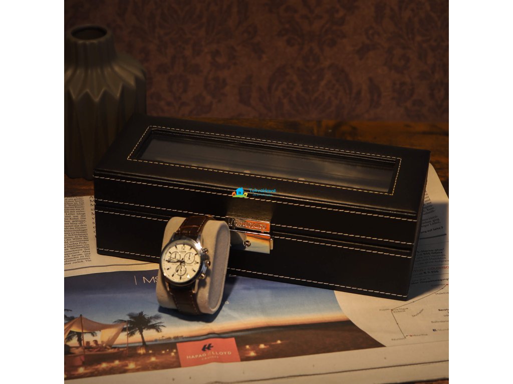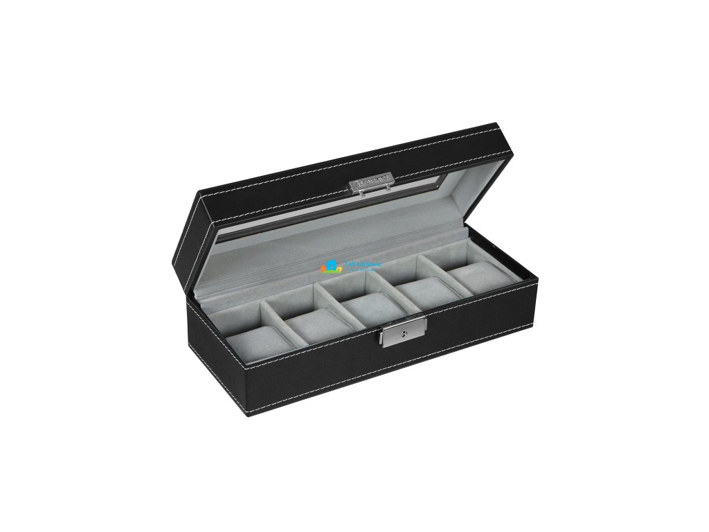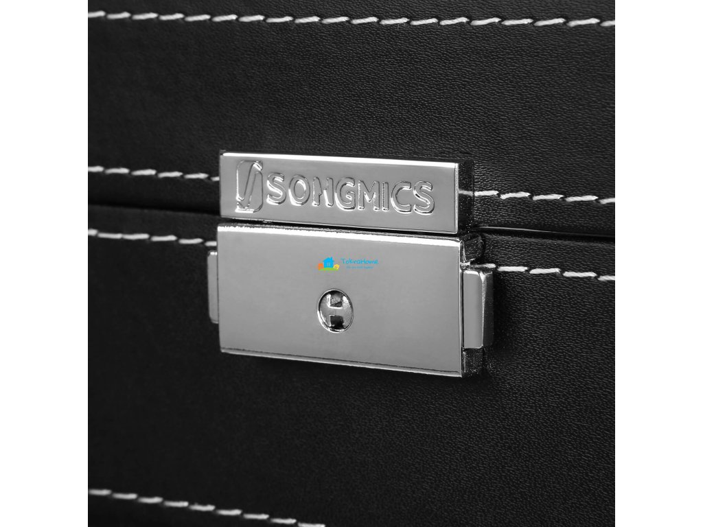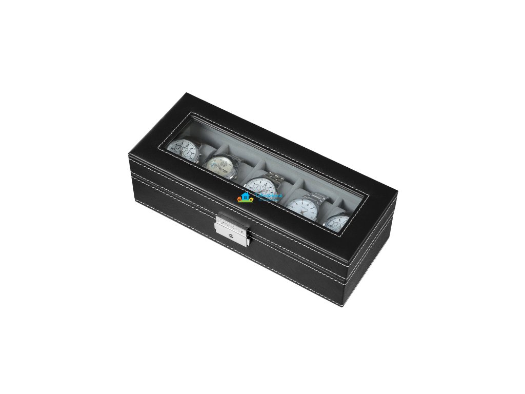Box na hodinky může být ideálním společníkem na cestách. Díky velkým přihrádkám lze uložit i větší hodinky. Rám z MDF desky zajišťuje robustnost a odolnost. Průhledné skleněné okénko ve víku optimálně prezentuje vaše krásné hodinky. V kombinaci s černou PU kůží a bílými švy je box na hodinky elegantní a estetický. Díky vyjímatelným polštářkům na hodinky slouží tento box nejen k uložení hodinek, ale lze jej použít i k uložení vašich šperků, jako jsou náhrdelníky nebo náušnice či jiné drobnosti. Box je vybaven zámkem na klíč, který vám poskytne bezpečnou ochranu. Také je uvnitř vybaven povrchem ze sametu, který ochrání vaše hodinky před poškrábáním.
