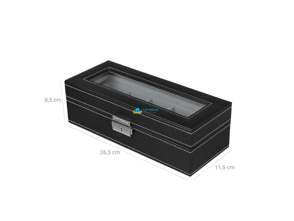 Box na hodinky, velké přihrádky, robustní a odolný, skleněné víko, vyjímatelné polštářky, zámek na klíč, černá