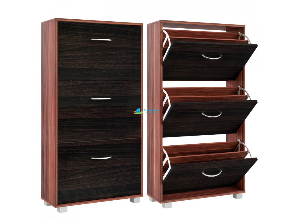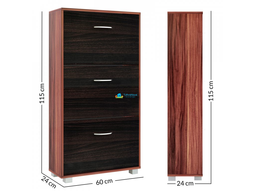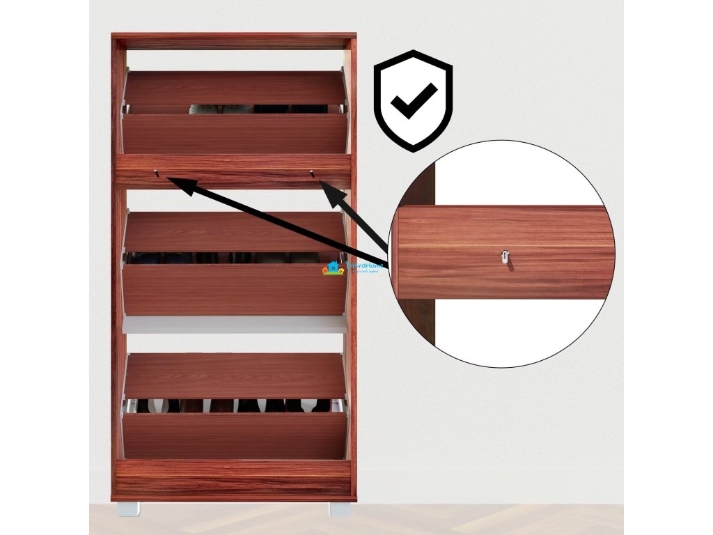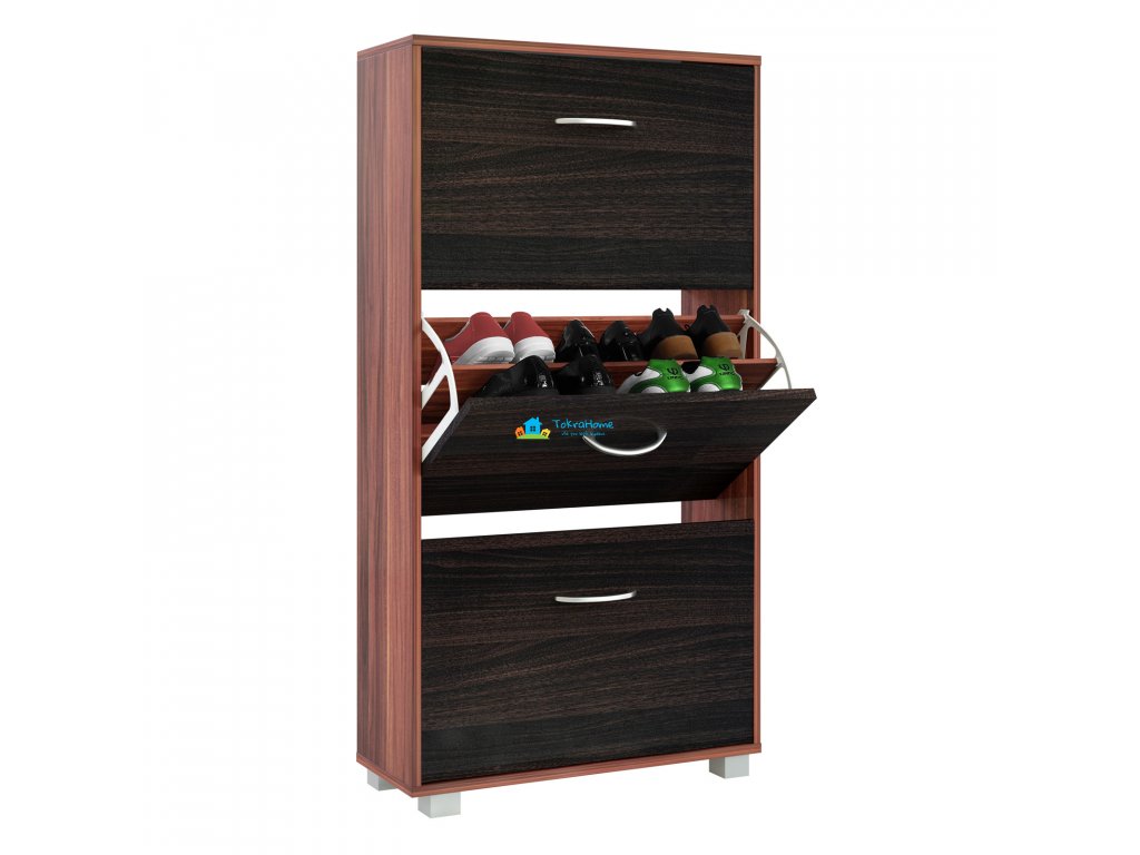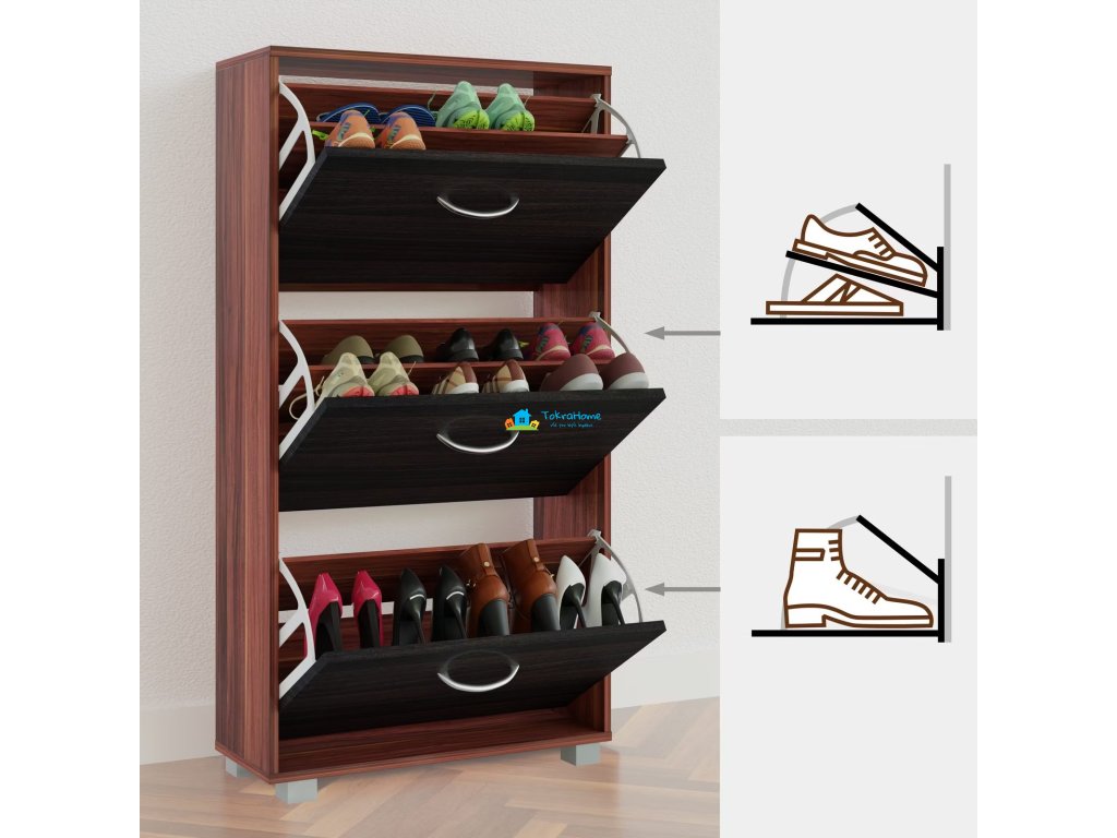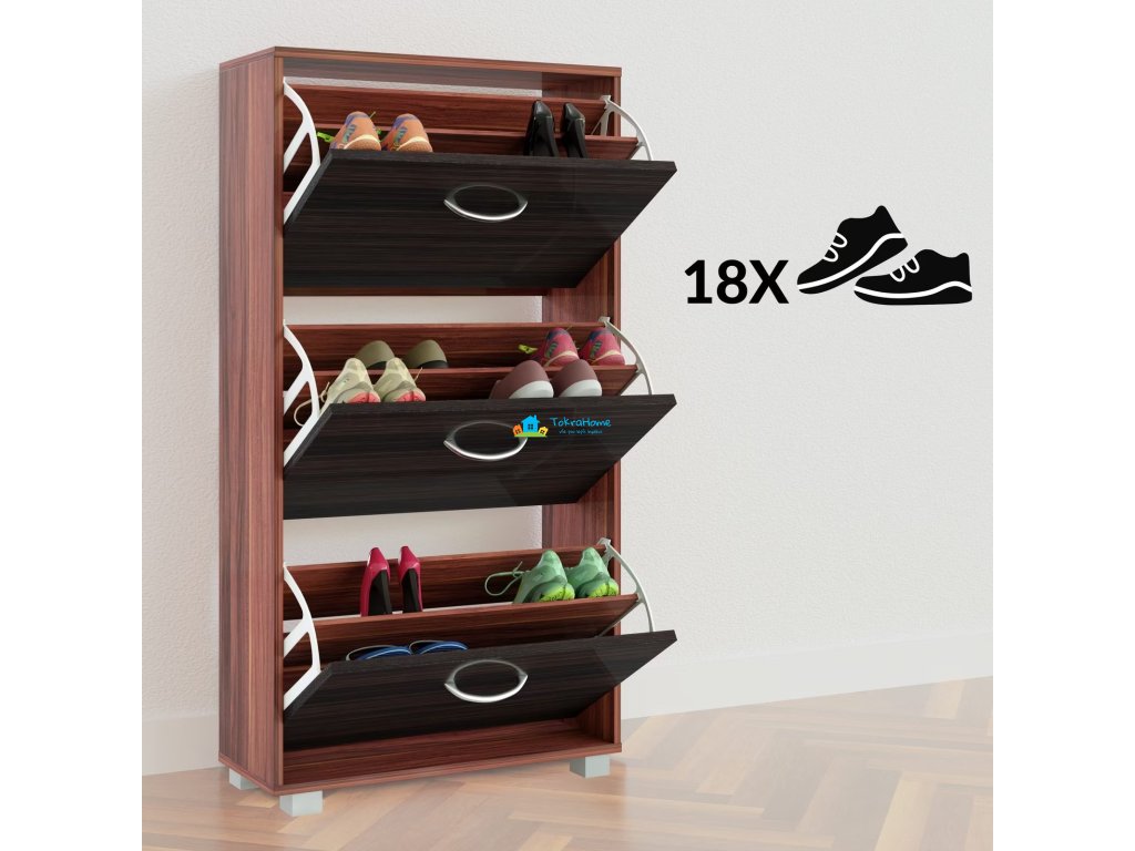 Už nevíte, kam si dát boty? Pak je tento botník pro vás ideální. Přesvědčí Vás moderním designem, prostorově úspornou velikostí a velmi prostorným interiérem. Tři velké police s rukojetí v hliníkovém vhledu - dostatek místa pro všechny vaše boty. Ať už se jedná o lodičky, velké tenisky nebo dokonce kotníkové boty. Díky nastavitelným a odnímatelným přepážkám v každé klapce můžete umístit všechny své oblíbené boty až do velikosti 45. Vzhledem k svému nadčasovému, modernímu designu botník dokonale zapadne do stávajících místností - chodba, předsíň, atd. Díky hloubce 24 cm je botník dostatečně úzký, aby se vešel i do malé chodby. Pojistka proti náklonu/překlopení, která je součástí balení, zajišťuje větší stabilitu při plném zatížení botníku.