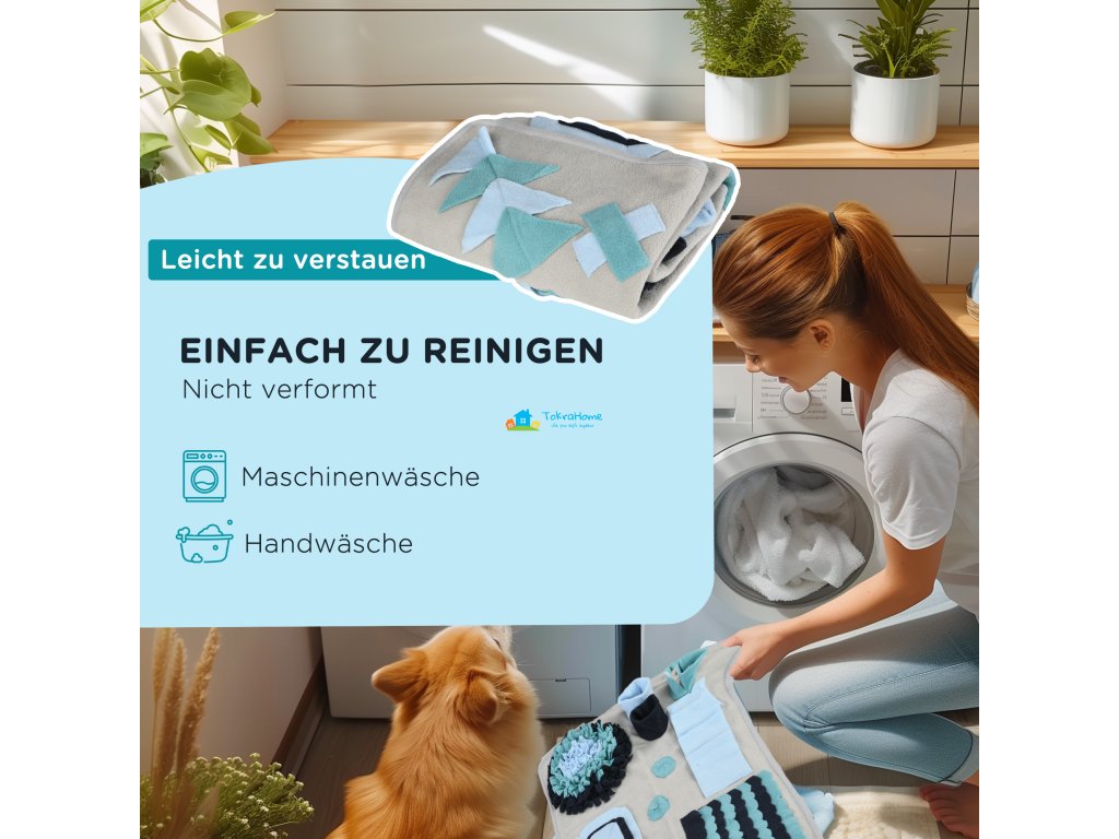 Čmuchací deka je praktická pomůcka i hračka, která podporuje pomalé krmení a zdravější trávení domácích mazlíčků. Granule nebo pamlsky se ukryjí do různých záhybů, kapes a otvorů na podložce a zvíře je musí vyčmuchat a postupně vytahovat. Díky tomu jí pomaleji, nehrozí hltání, nadýmání ani přejídání a zároveň se posiluje jeho přirozený čichový instinkt. Podložka je vyrobena z kvalitního polyesteru, má měkký povrch šetrný k tlapkám i čumáku a spodní část s protiskluzovou úpravou, která brání posouvání při používání.