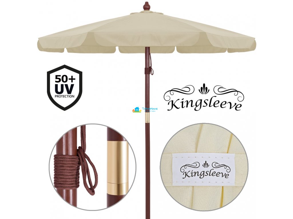 Slunečník Ø 330 cm béžové barvy od Kingsleeve, UV ochrana 50+, vodoodpudivý, dřevěná pevná konstrukce.
