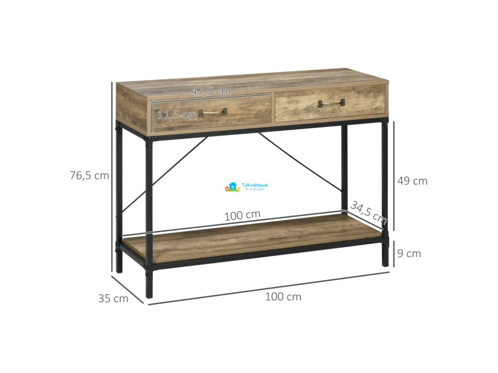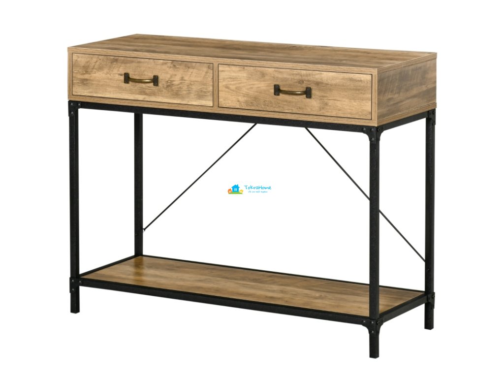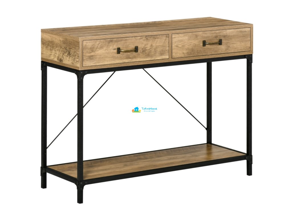 Konzolový stolek, se dvěma zásuvkami, horní a spodní deska, ochrana proti převrácení, kombinace kovu a dekoru dřeva, hnědo-černý
