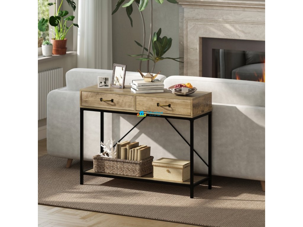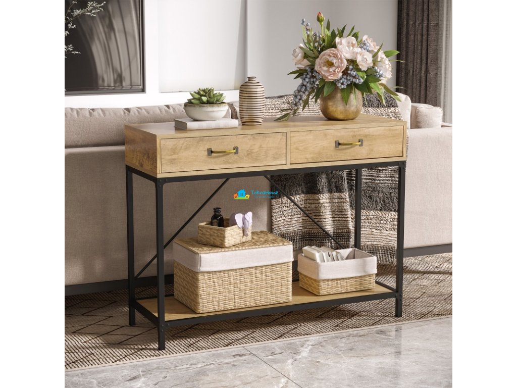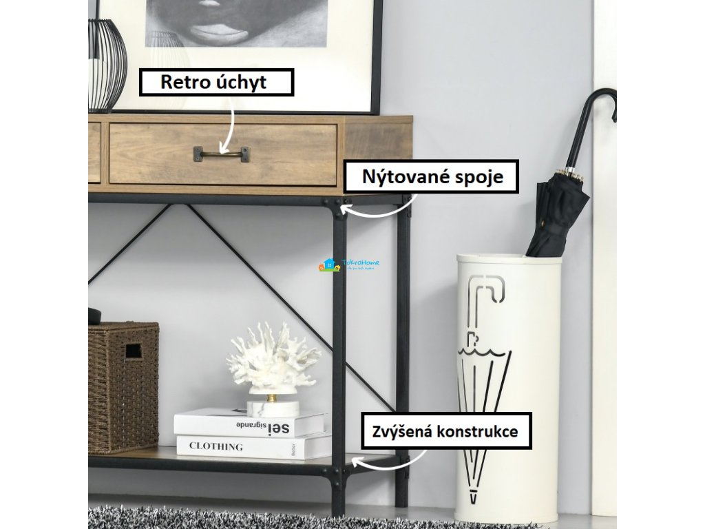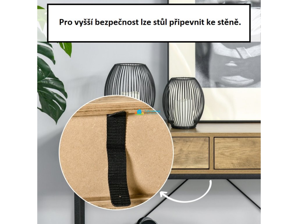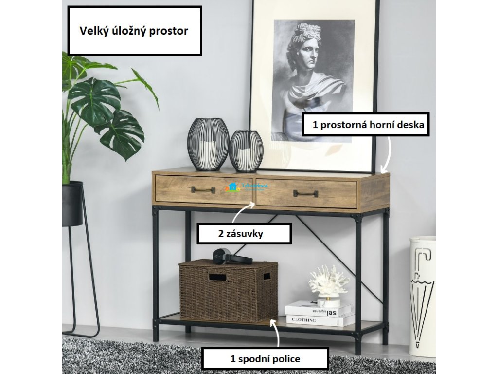 Konzolový stolek HOMCOM v industriálním stylu kombinuje černý kovový rám s dekorem dřeva a retro úchytkami, čímž dodá interiéru moderní a stylový vzhled. Nabízí dvě prostorné výsuvné zásuvky, velkou horní desku a spodní polici, které poskytnou dostatek místa pro uložení i vystavení dekorací, knih či rostlin. Stabilní konstrukce z kovu a odolné dřevotřísky s V-výztuhou zajišťuje nosnost až 30 kg, zatímco ochrana proti převrácení a možnost upevnění ke zdi přidávají na bezpečnosti. Díky zvýšenému soklu je navíc úklid pod stolkem snadný a rychlý.