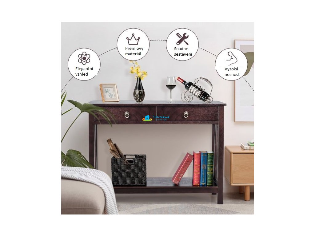 Konzolový stolek se zásuvkami, vysoce kvalitní materiál, nosnost až 50 kg, dostatek úložného prostoru, praktický design, snadná montáž a čištění, hnědý.