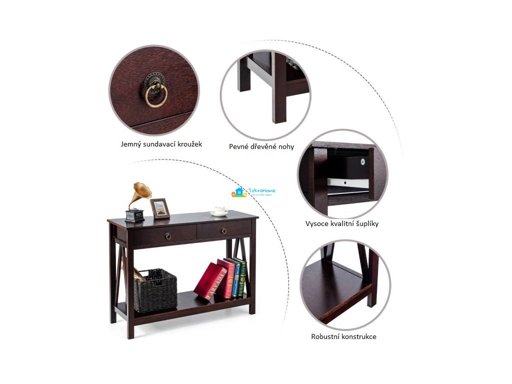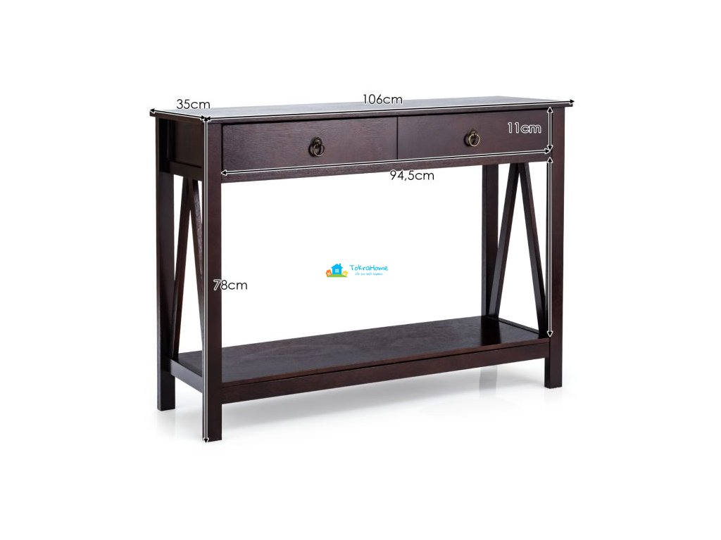 Tento konzolový stolek je vyroben z prvotřídního masivního dřeva a pevné MDF desky, což zajištuje dlouhodobou životnost stolku. Maximální nosnost stolku je 50 kg. Stolek má dvě prostorné zásuvky a spodní polici, kam si můžete uložit spoustu věcí dle uvážení. Povrch stolku je vodoodpudivý a můžete ho snadno čistit vlhkým hadříkem. Jednoduchá montáž.