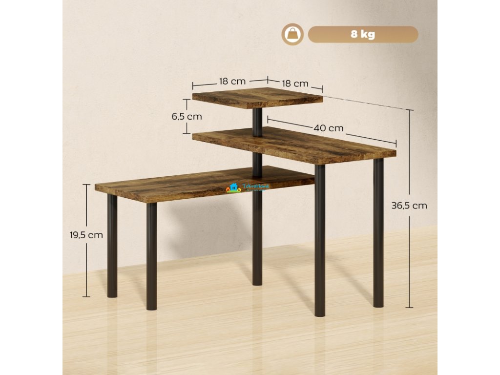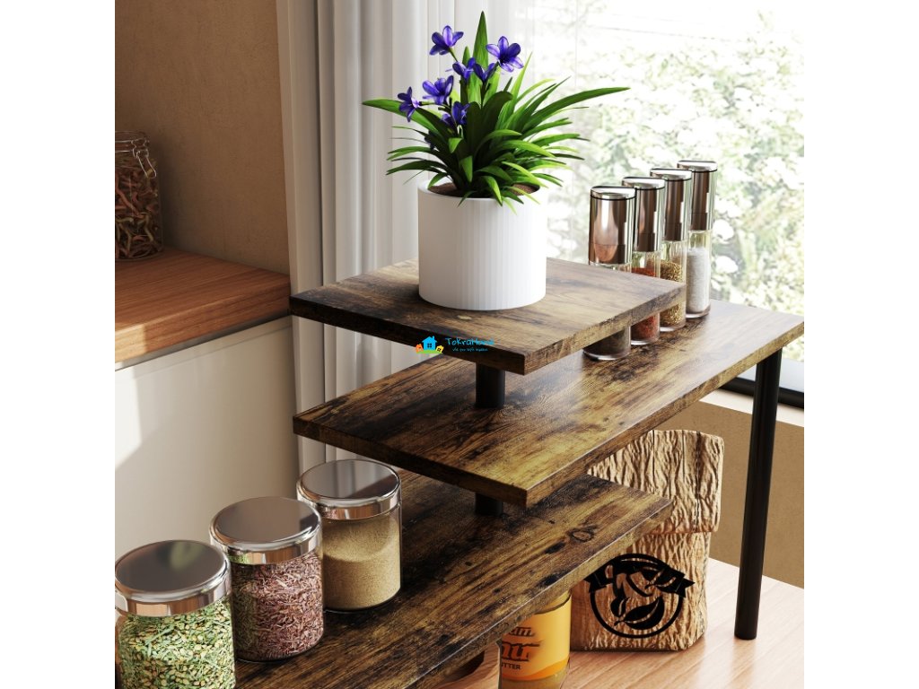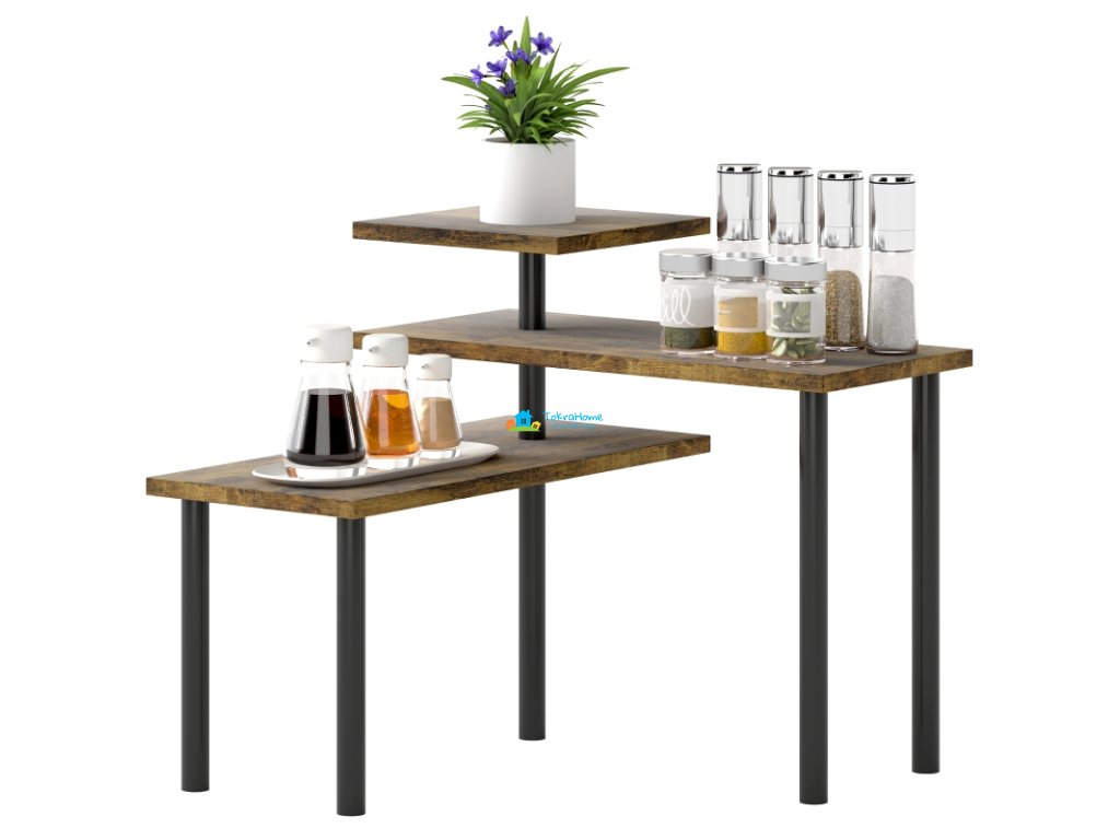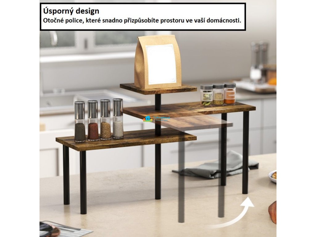 Kuchyňská police značky HOMCOM s moderním rustikálním designem nabízí tři stupňovité úložné úrovně, které lze jednotlivě otáčet a snadno tak přizpůsobit rozložení prostoru – ať už jej chcete umístit do rohu, podél stěny, nebo vytvořit praktický vějířovitý tvar. Díky kompaktním rozměrům 40 × 18 × 36,5 cm efektivně využívá i malé plochy, přičemž poskytuje dostatek místa pro uspořádání koření, kuchyňských potřeb, drobných spotřebičů nebo dekorací. Pevná konstrukce z odolné dřevotřísky a kovových trubek zajišťuje dlouhou životnost, lakovaný povrch je voděodolný a snadno se čistí, a ochranné podložky na nožkách chrání pracovní desku před poškrábáním a zvyšují stabilitu. Regál unese 2 kg na každé polici (celkem 8 kg) a jeho montáž zvládne jedna osoba zhruba za 30 minut, což z něj činí praktické a stylové řešení pro každou kuchyň i domácnost.