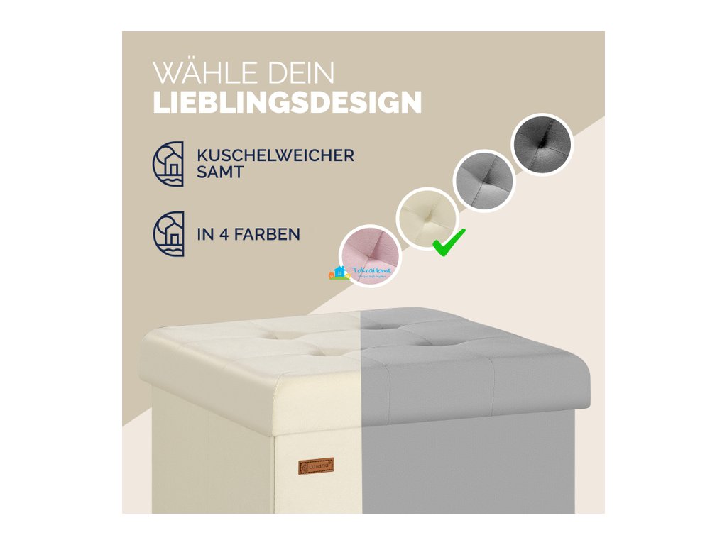 Konstrukce taburetu je pevná a odolná, s nosností až 300 kg, takže slouží nejen jako úložný box, ale i jako spolehlivé sedátko. Snadno se udržuje a při nepoužívání ho lze jednoduše složit a uložit, což šetří místo. Díky kombinaci kvalitního MDF, měkkého sametu a pohodlné pěnové výplně spojuje tento taburet funkčnost s elegantním stylem a stane se univerzálním pomocníkem i dekorativním prvkem vašeho domova.
