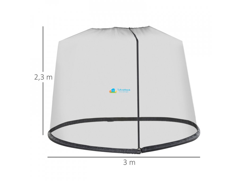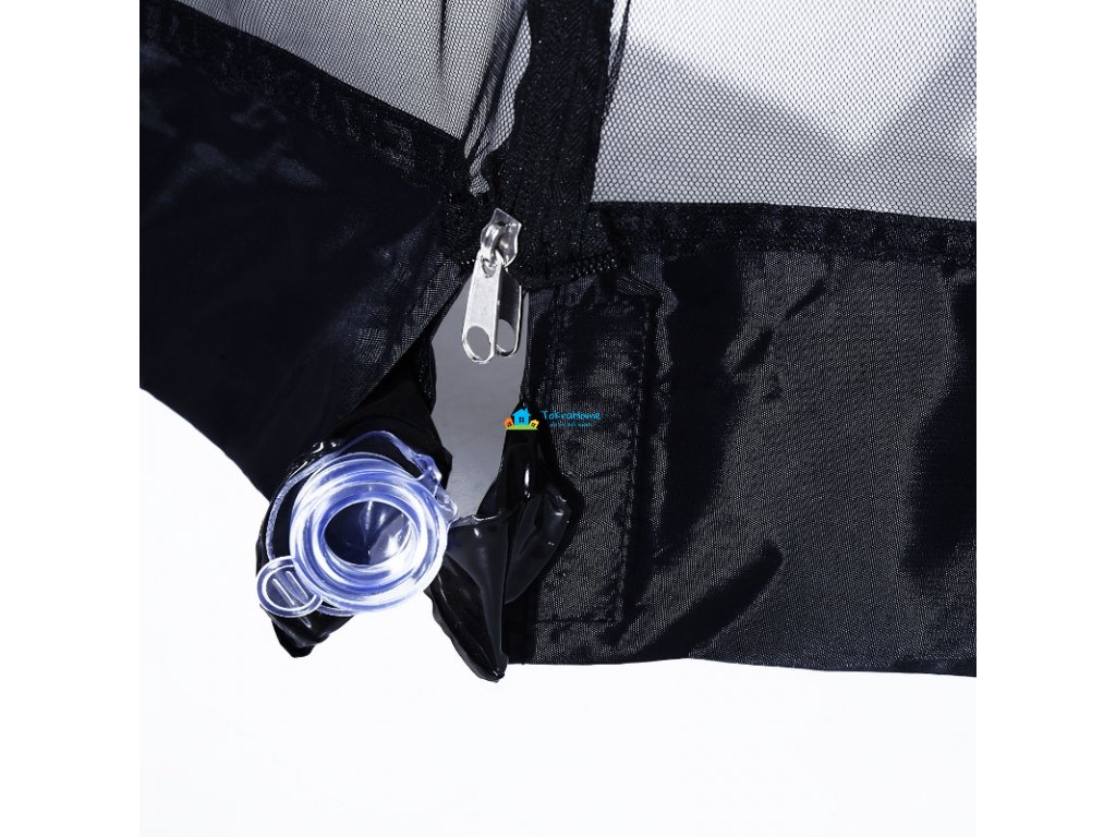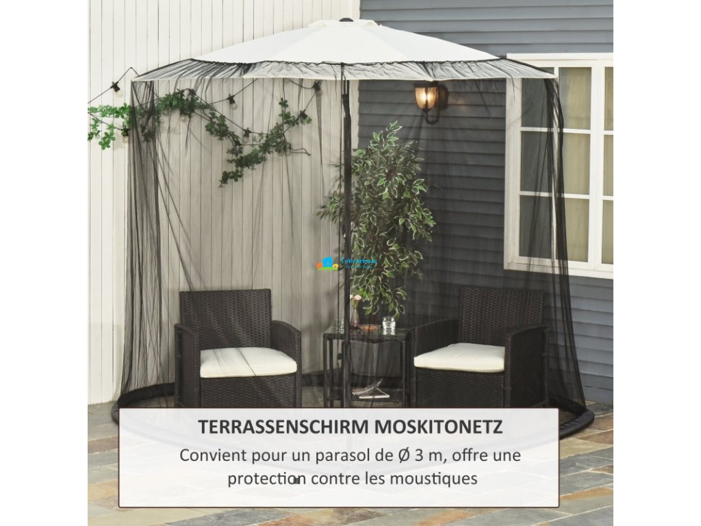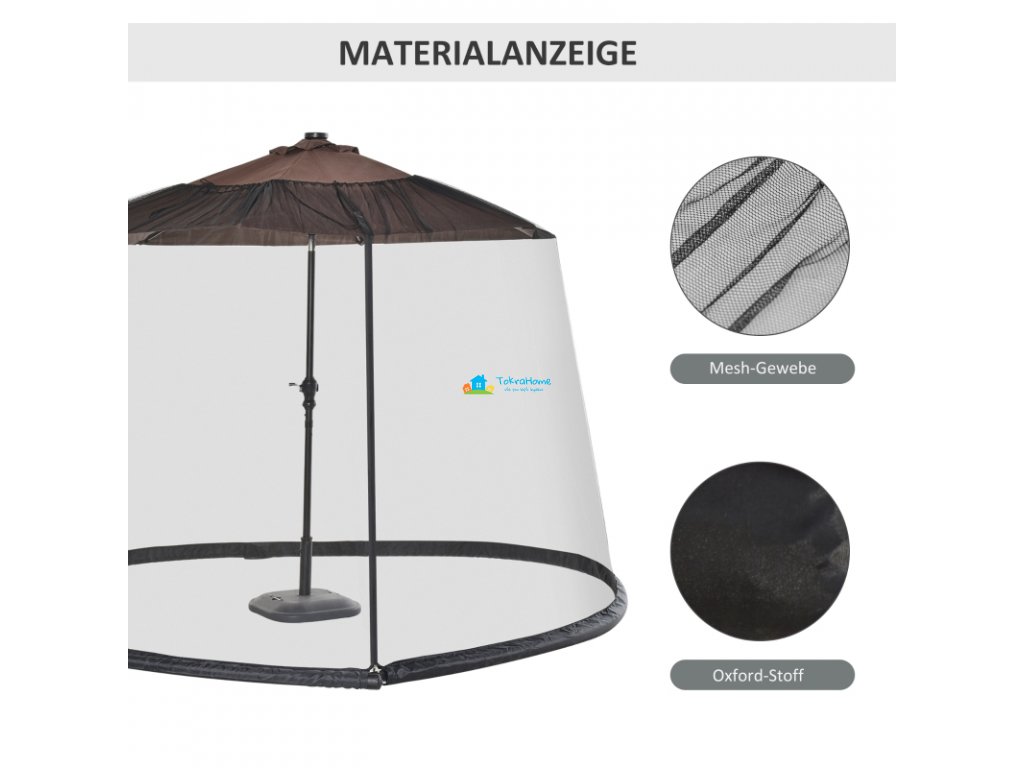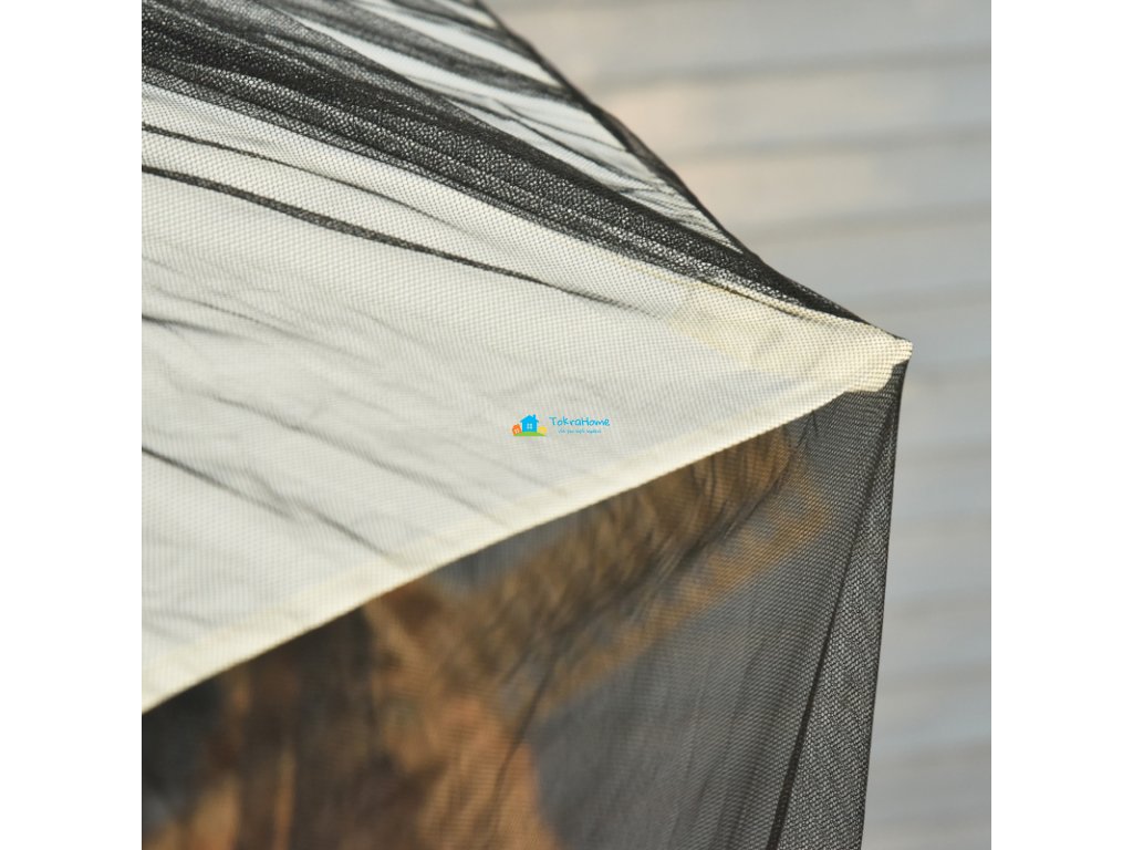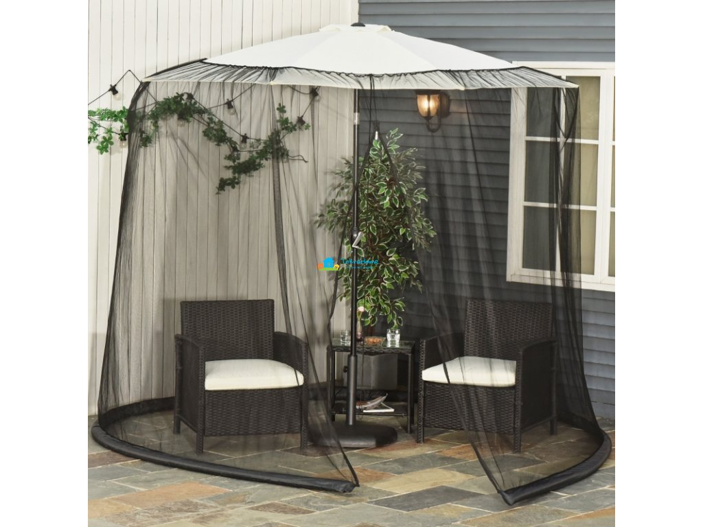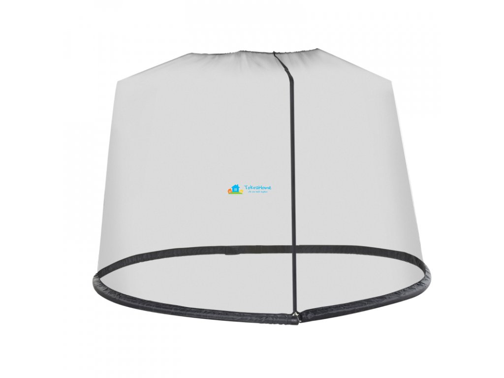 Venkovní síť proti hmyzu pro slunečníky o průměru do tří metrů, vrchní stahovací šňůrka, délka 230 cm, stabilní ve větru díky hadici na vodu ve spodní části sítě, suchý zip pro snadný vstup a výstup. Černé barvy.