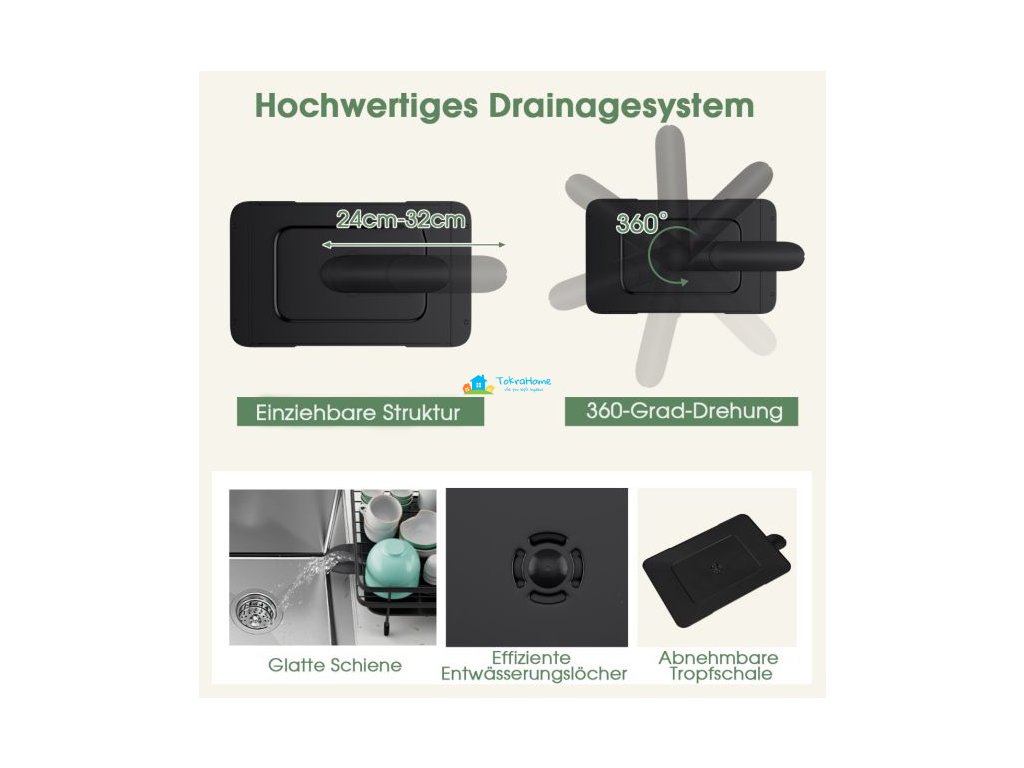 Tento stojan na sušení nádobí je navržen s jedinečnou skládací konstrukcí a lze jej složit do 1 patra nebo rozložit na 2 patra podle vašich požadavků. Odkapávač disponuje několika odkládacími plochami - vrchni plocha pojme 10 talířů, spodní plocha 10 misek, 4 - 10 šálků a třídrážkový příborník s bambusovým uzávěrem pro více než 30 příborů. Bude tak skvělým kuchyňským pomocníkem, který vám pomůže přehledně umístit vaše čistě umyté nádobí. Odnímatelná odkapávací miska s výsuvnou výlevkou pomáhá zabránit hromadění vody a zajišťuje rychlý odtok. Navíc můžete nastavit délku výlevky od 24 - 32 cm a otáčet ji ve všech směrech, pro lepší odtok vody. Kovový rám odkapávače je práškově lakovaný, a tím nepodléhá korozi a zvyšuje svou životnost. Protiskluzové nožičky mohou také zvýšit celkovou stabilitu a zabrání poškrábání vaší kuchyňské linky. Tento dvoupatrový stojan na nádobí lze snadno sestavit bez použití nářadí nebo šroubů, což šetří práci a čas. Umožňuje okamžité použití po jeho vyjmutí.