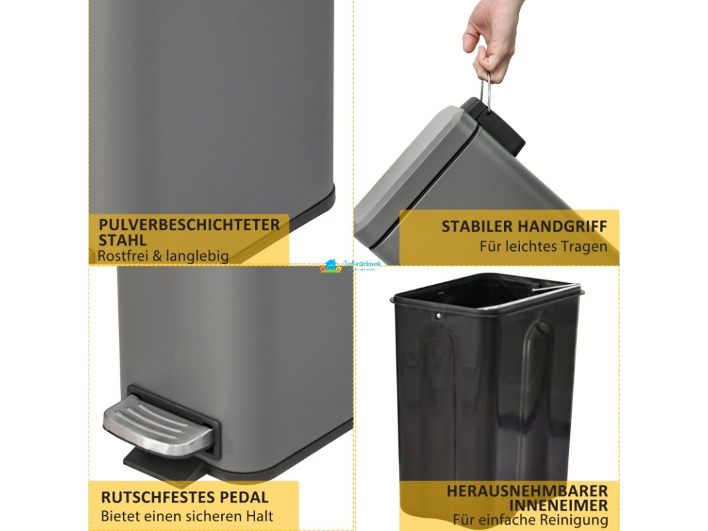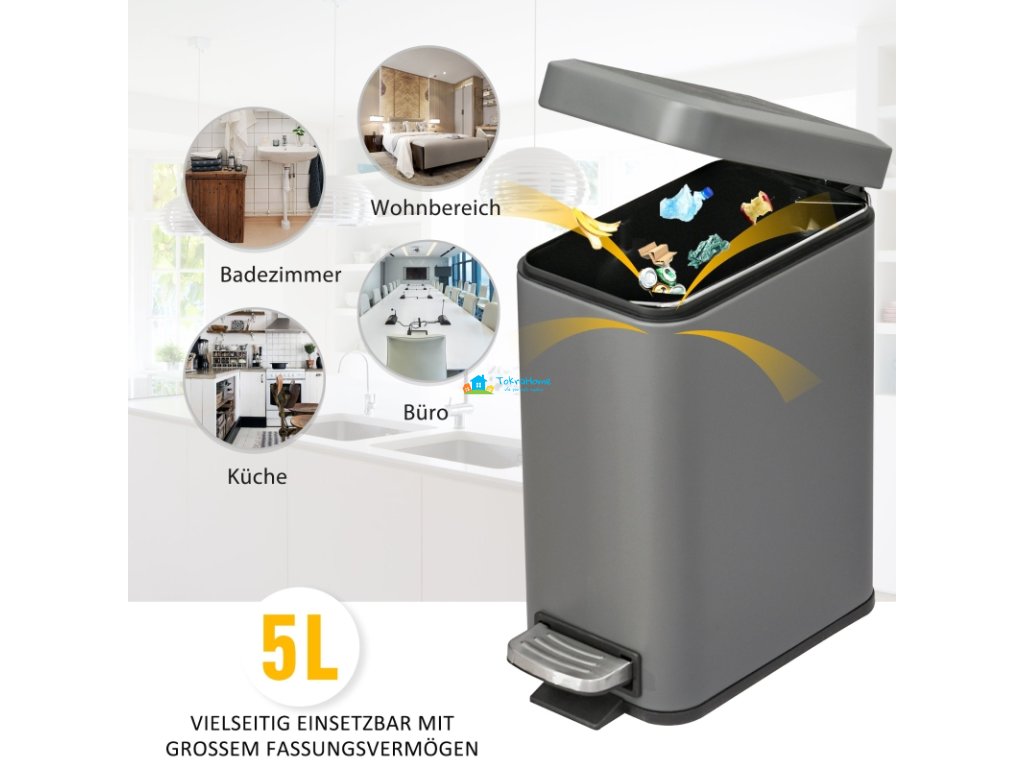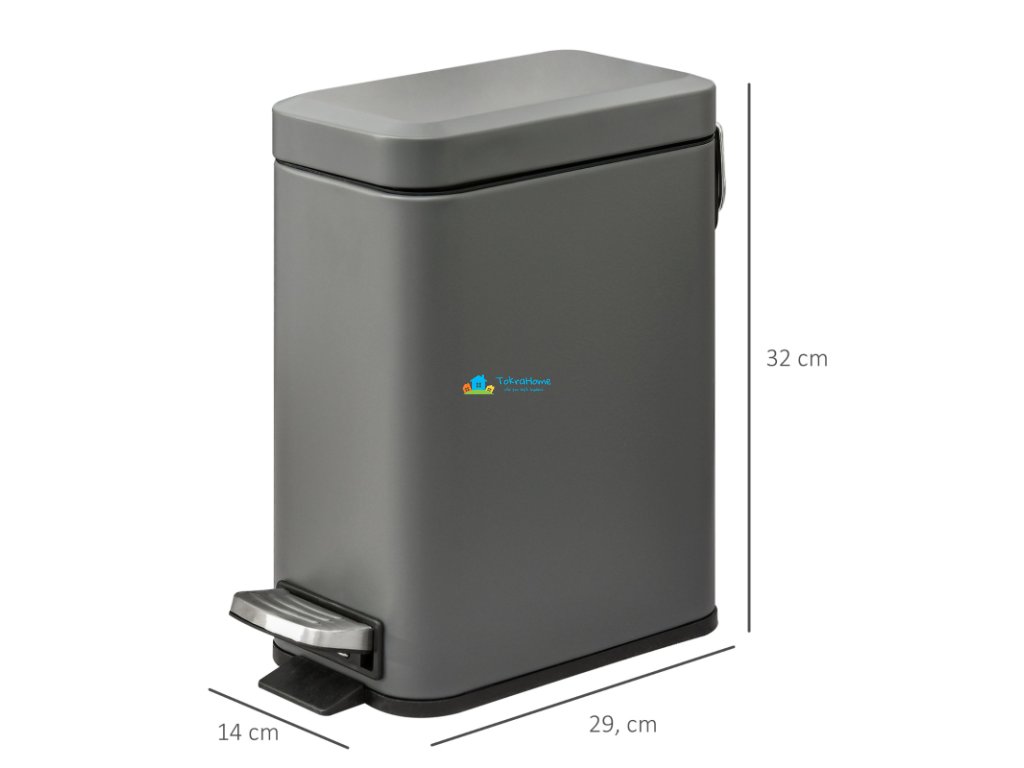 Tento stylový obdélníkový odpadkový koš se dobře hodí do kanceláří, koupelen a dalších míst vašeho domova. Má robusní kovové pouzdro. Povrch koše poskytuje dostatečnou pevnost a odolnost. S objemem pěti litrů nabízí dostatek prostoru. Navíc je vybaven vyjímatelným vnitřním kbelíkem pro snadné čištění, rukojetí pro vyjmutí a protiskluzovou základnou. Jemně a tiše se zavírající víko v kombinaci s velkým nožním pedálem zajišťuje otevírání a zavírání bez námahy.
