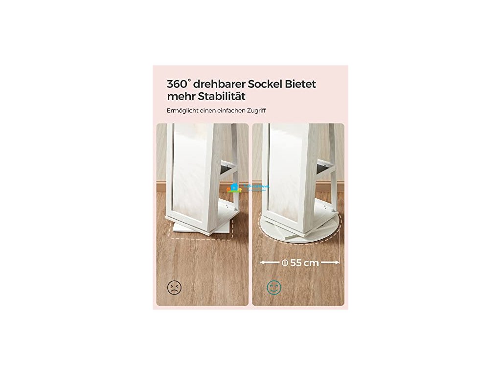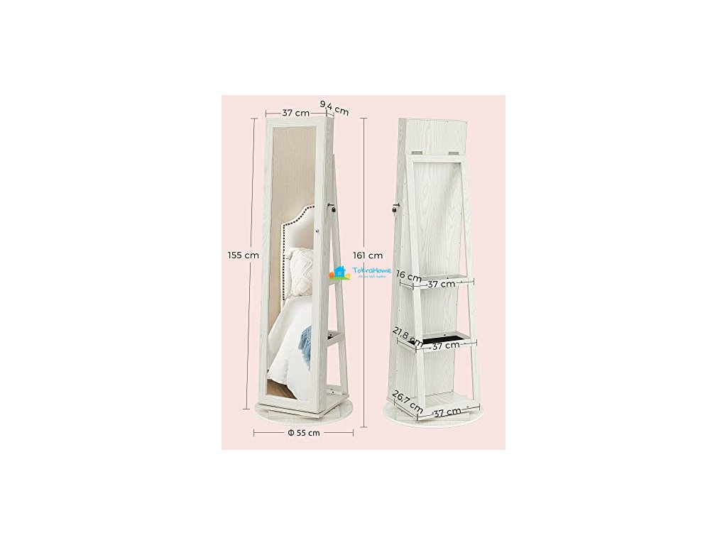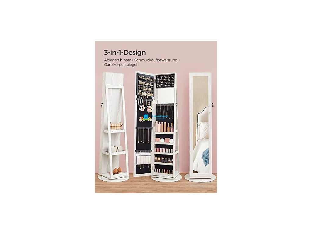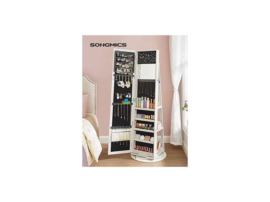 Skříňka na šperky, toaletní zrcadlo a úložná police v jednom. Díky funkci otáčení o 360° dokáže perfektně zobrazit vaše šperky v každém úhlu. 2 police na zadní straně zrcadlové skříňky nabízejí úložné možnosti pro vaše tašky, make-up nástroje a kusy oblečení. S vestavěným zrcátkem není nutné zavírat dveře, abyste se mohli dívat do zrcadla.
