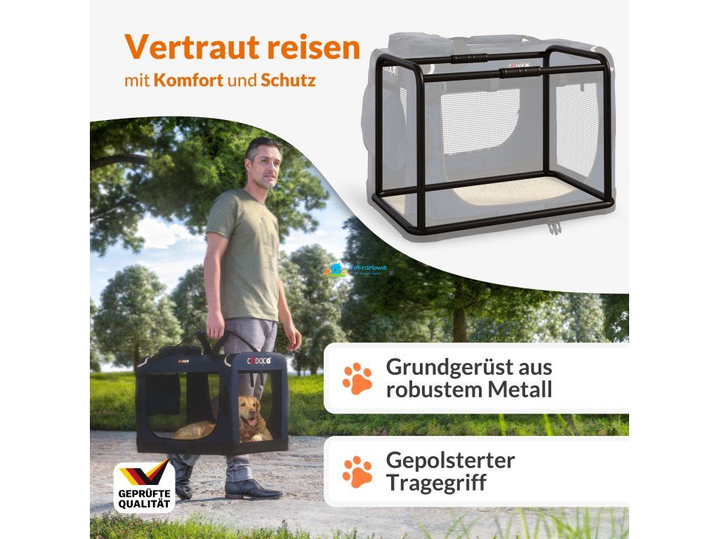 Box je navržen tak, aby byl pohodlný nejen pro zvíře, ale i pro jeho majitele. Síťované boční části zajišťují dobrou cirkulaci vzduchu, a tím i příjemné prostředí uvnitř. Přední a boční vstup usnadňují manipulaci se zvířetem a umožňují pohodlný přístup podle potřeby. Měkká podložka uvnitř zvyšuje komfort při ležení a dělá z boxu příjemné místo pro odpočinek doma i na cestách.