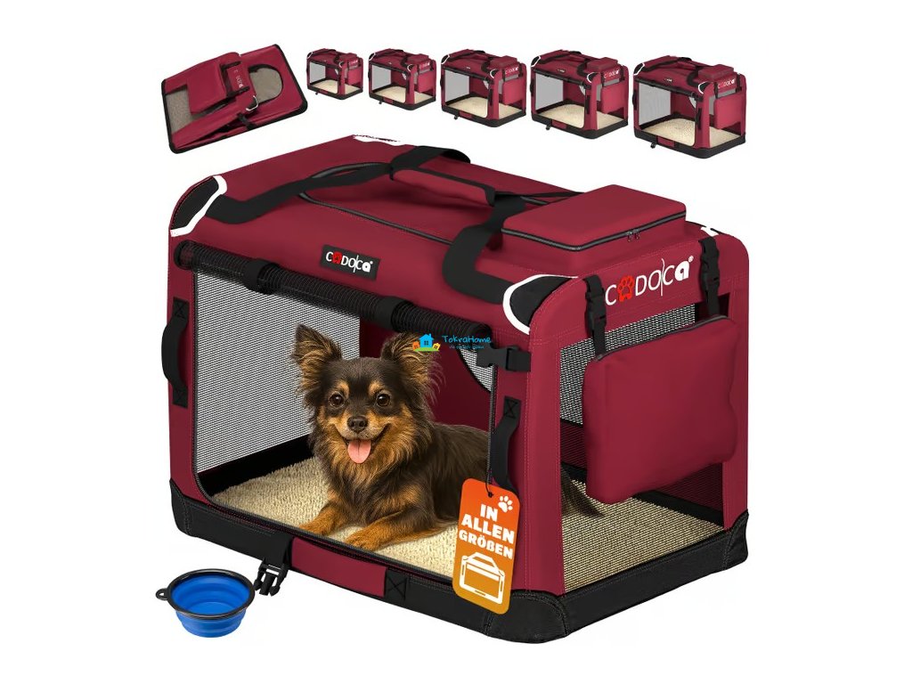 Přepravní box pro psy nebo kočky, skládací, velikost S, síťované okna, vchody se zipem, 2 prostorné kapsy, odolná tkanina, s plyšovou dekou, včetně misky, červený