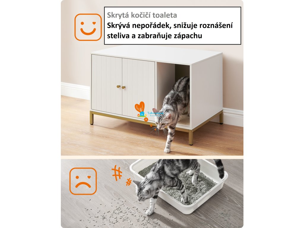 Skříňka na kočičí toaletu, prostorná, multifunkční, snadná montáž a údržba, z dřevotřísky a oceli, bílo-zlatá