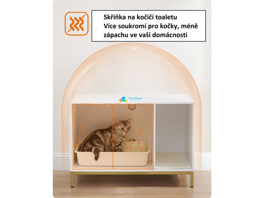 Stylová skříňka na kočičí toaletu v bílé barvě se zlatým kovovým rámem elegantně zapadne do každého interiéru. Vnitřní prostor o rozměrech 52 × 50 × 41,9 cm pojme většinu běžných kočičích toalet, přičemž přední vstup umožňuje flexibilní umístění. Díky dvířkům se snadno čistí a zvýšené nohy usnadní úklid pod skříňkou.