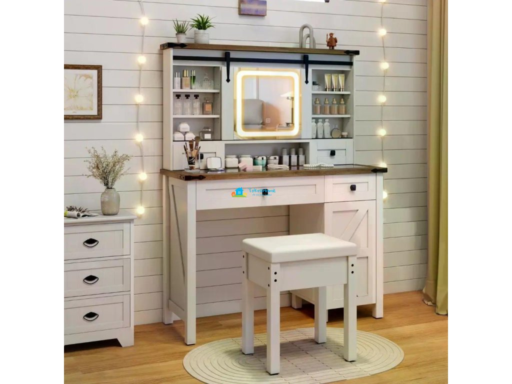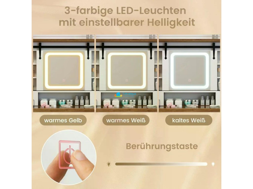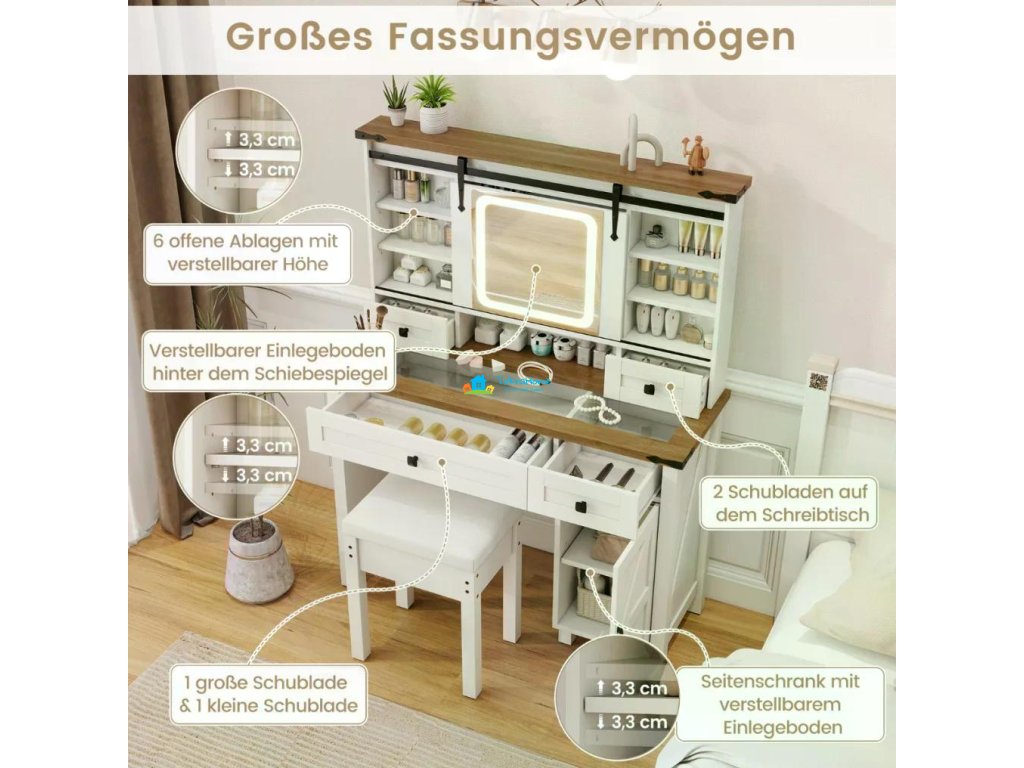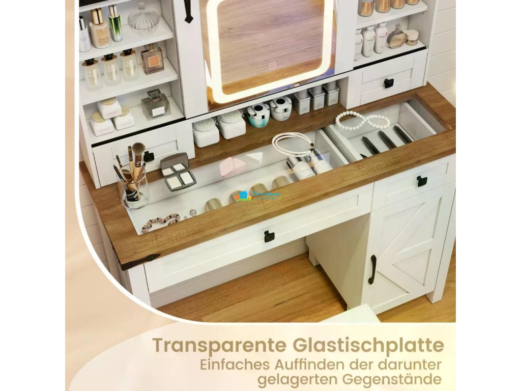 Vylepšete si každodenní rutinu s naším toaletním stolkem. Tato toaletní souprava má jedinečný design rustikálních dveří a dekorací, které dodají vašemu prostoru venkovský šarm. Posuvné zrcadlo umožňuje snadný přístup k úložným policím za zrcadlem a LED světla nabízejí nastavitelný jas a možnost tříbarevného osvětlení - teplé žluté, teplé bílé nebo studené bílé. Navíc si udržíte pořádek díky malým a velkým zásuvkám a boční skříňce. Každá otevřená i skrytá police má navíc 3 nastavitelné výšky, do kterých lze uložit předměty různé výšky. Skleněná deska navíc usnadňuje vyhledávání šperků. Díky modernímu designu a promyšleným funkcím je tato toaletní souprava s taburetem stylovým a praktickým dárkem pro vaše blízké. Snadné čištění vlhkým hadříkem.