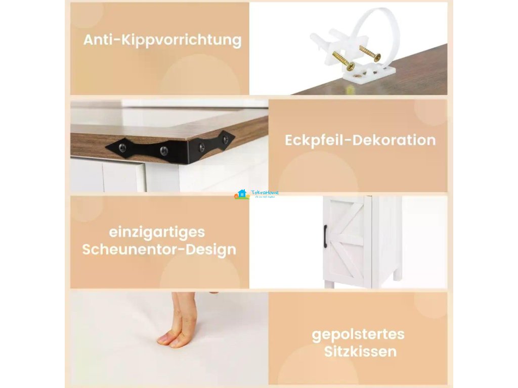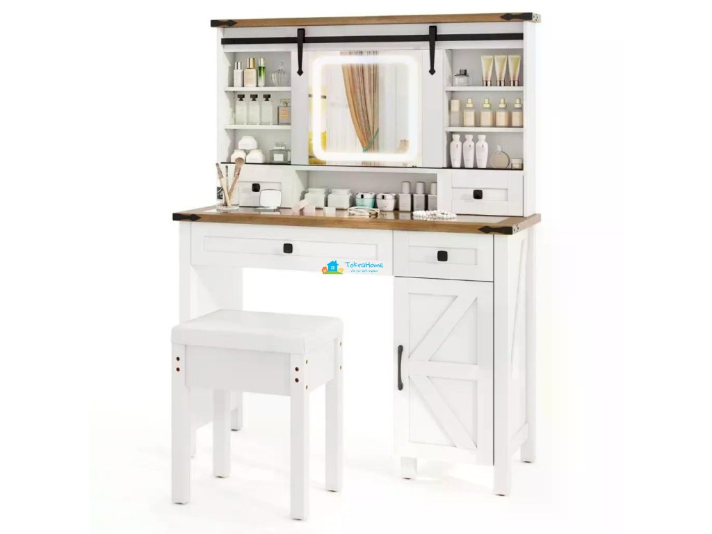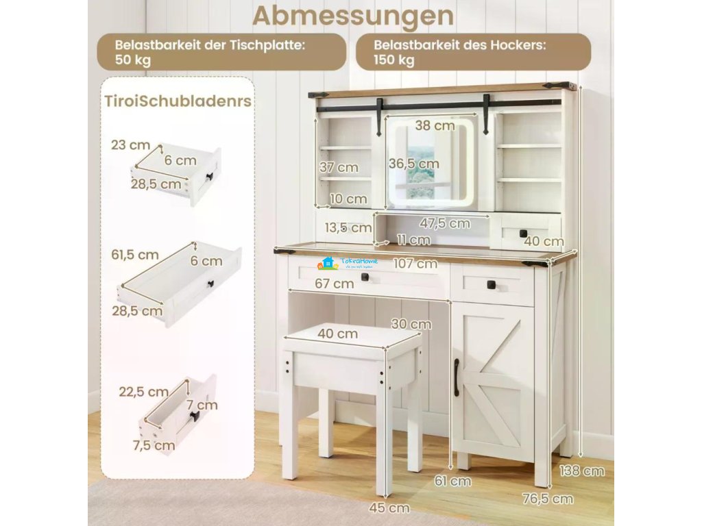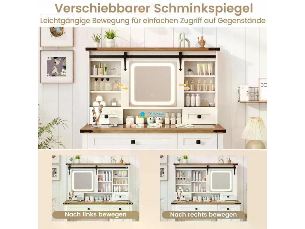 Vylepšete si každodenní rutinu s naším toaletním stolkem. Tato toaletní souprava má jedinečný design rustikálních dveří a dekorací, které dodají vašemu prostoru venkovský šarm. Posuvné zrcadlo umožňuje snadný přístup k úložným policím za zrcadlem a LED světla nabízejí nastavitelný jas a možnost tříbarevného osvětlení - teplé žluté, teplé bílé nebo studené bílé. Navíc si udržíte pořádek díky malým a velkým zásuvkám a boční skříňce. Každá otevřená i skrytá police má navíc 3 nastavitelné výšky, do kterých lze uložit předměty různé výšky. Skleněná deska navíc usnadňuje vyhledávání šperků. Díky modernímu designu a promyšleným funkcím je tato toaletní souprava s taburetem stylovým a praktickým dárkem pro vaše blízké. Snadné čištění vlhkým hadříkem.