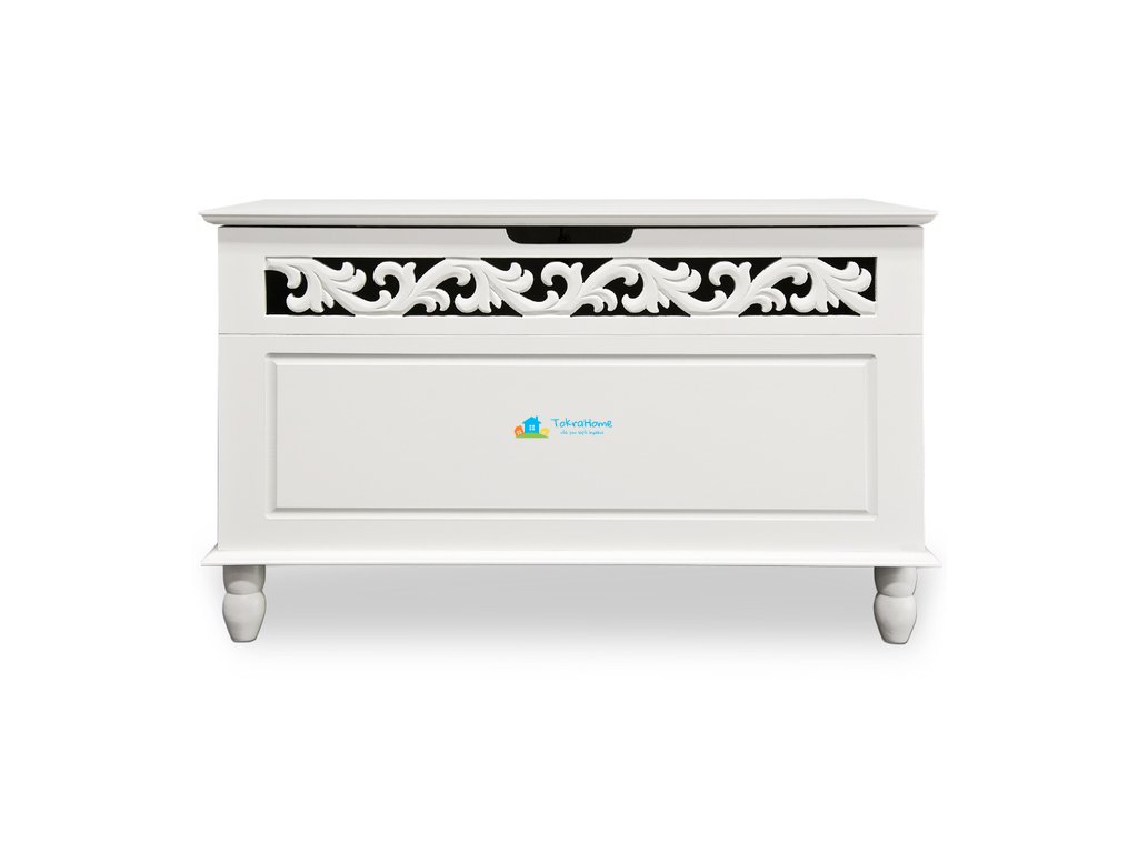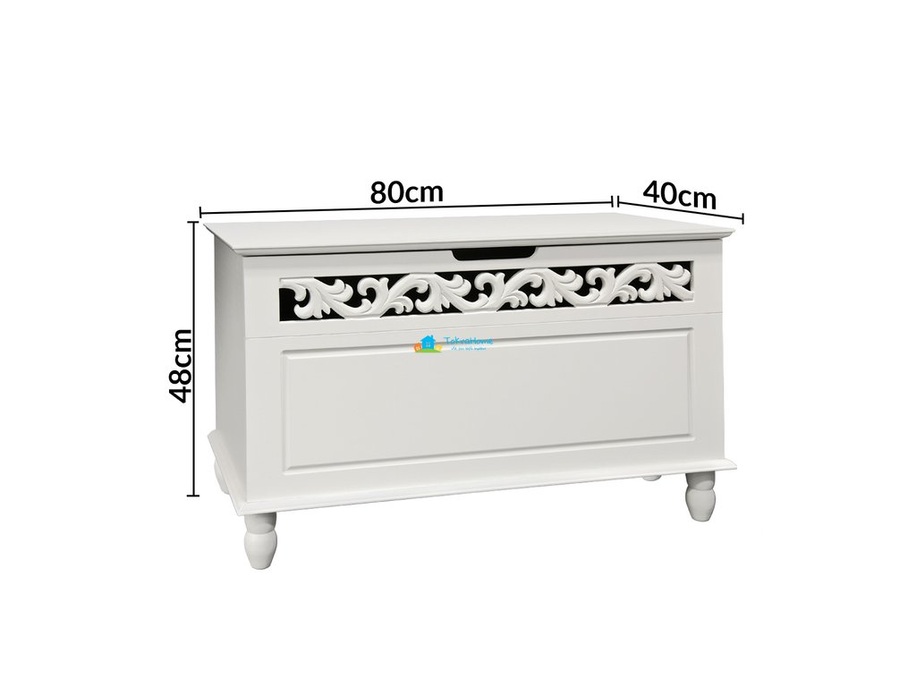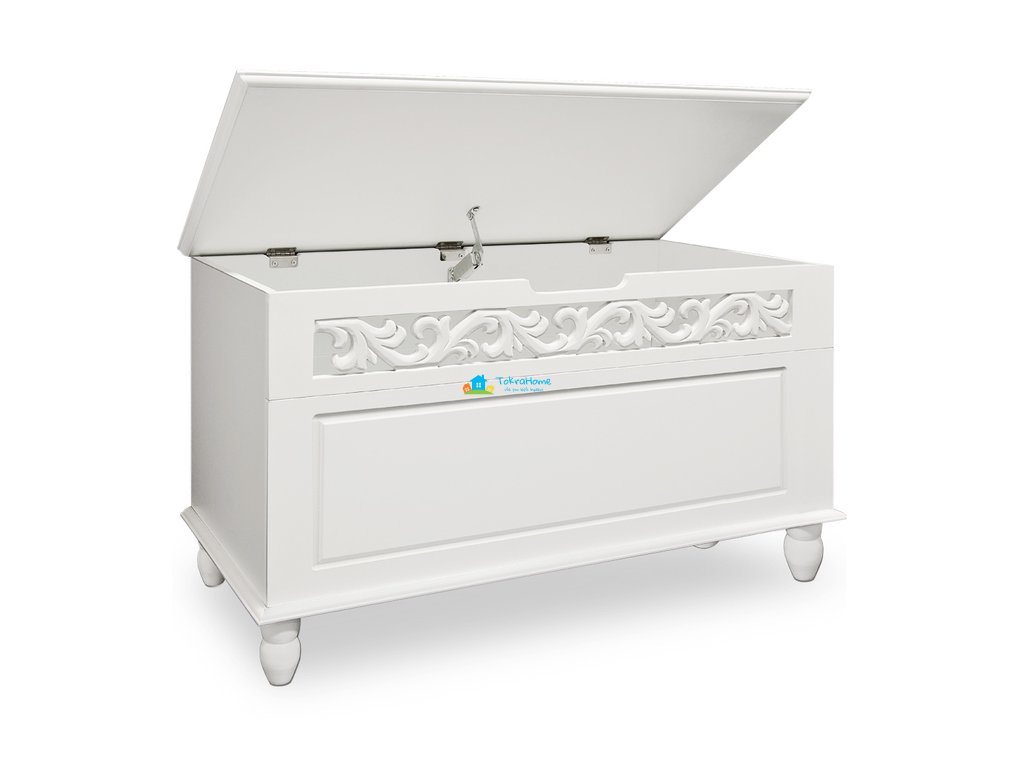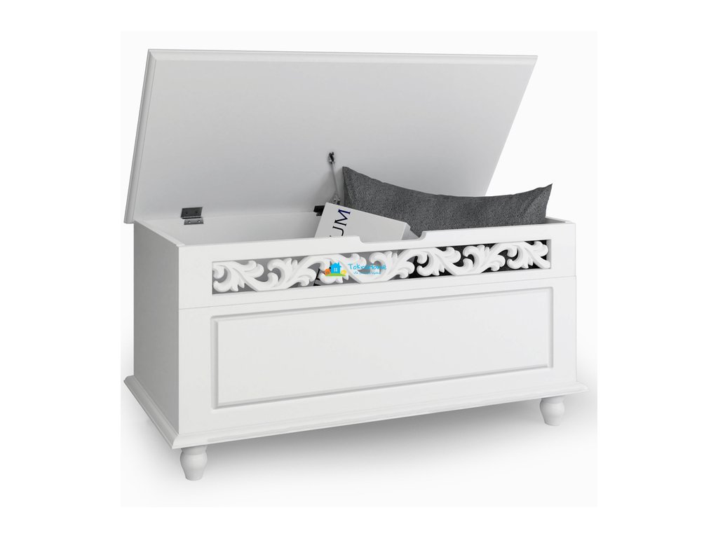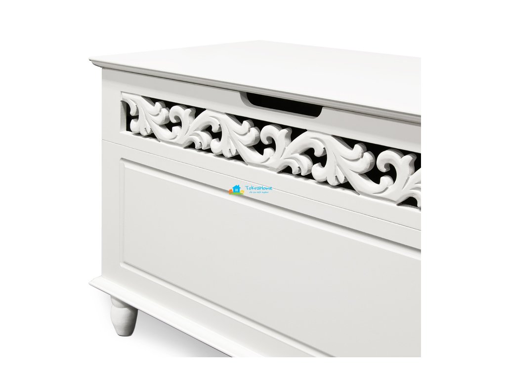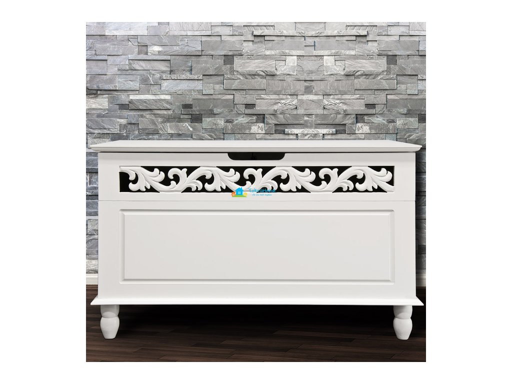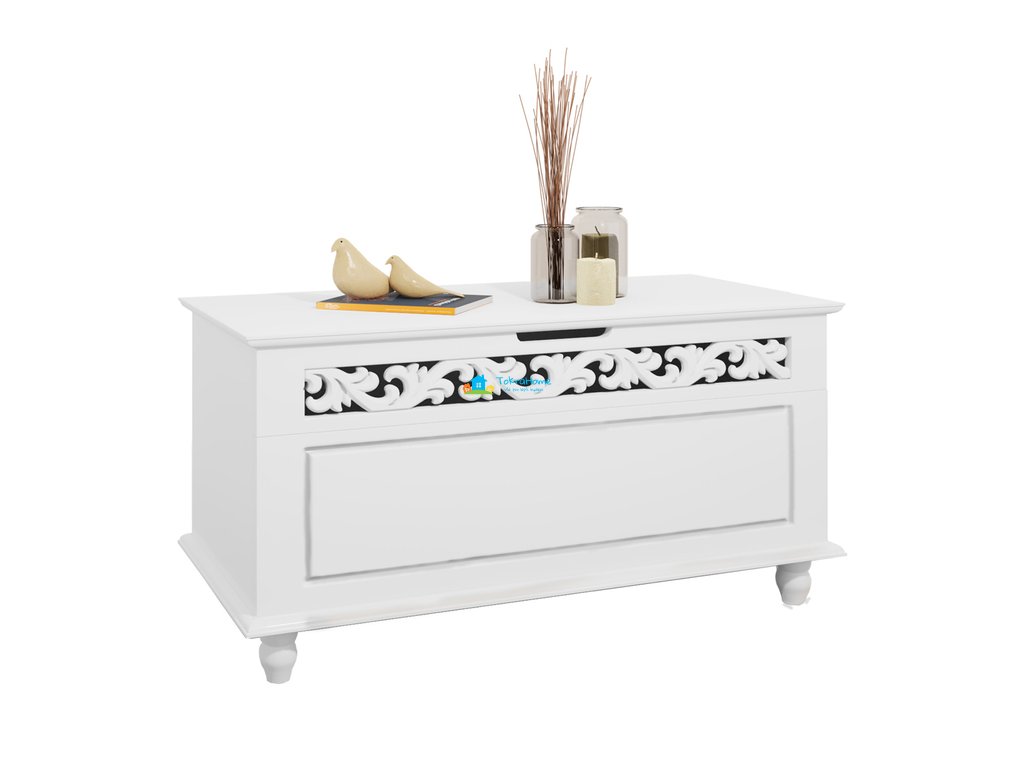 Robustní konstrukce z kvalitního MDF materiálu v bílé barvě je doplněna o dekorativní dřevěné prvky a stabilní plastové nožky. Díky nosnosti až 100 kg lze truhlu využít nejen jako úložný box, ale také jako lavici nebo konferenční stolek. Stylové provedení se hodí do moderních i klasických interiérů a díky snadné montáži je truhla praktickým a dekorativním doplňkem každé domácnosti.