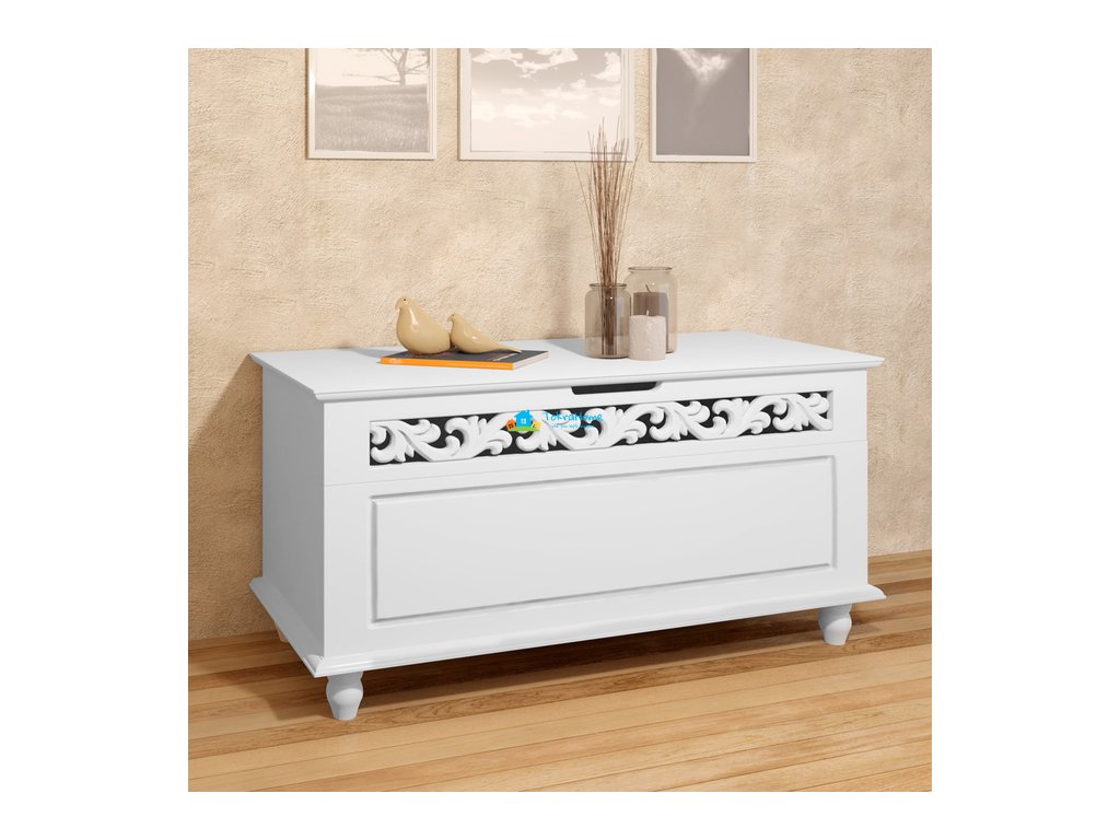Dřevěná truhla, nosnost 100kg, robustní konstrukce, praktický držák víka, pevné nožky, dekorativní dřevěné prvky, bílá