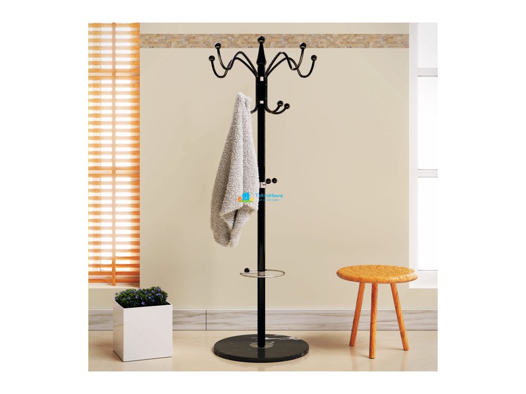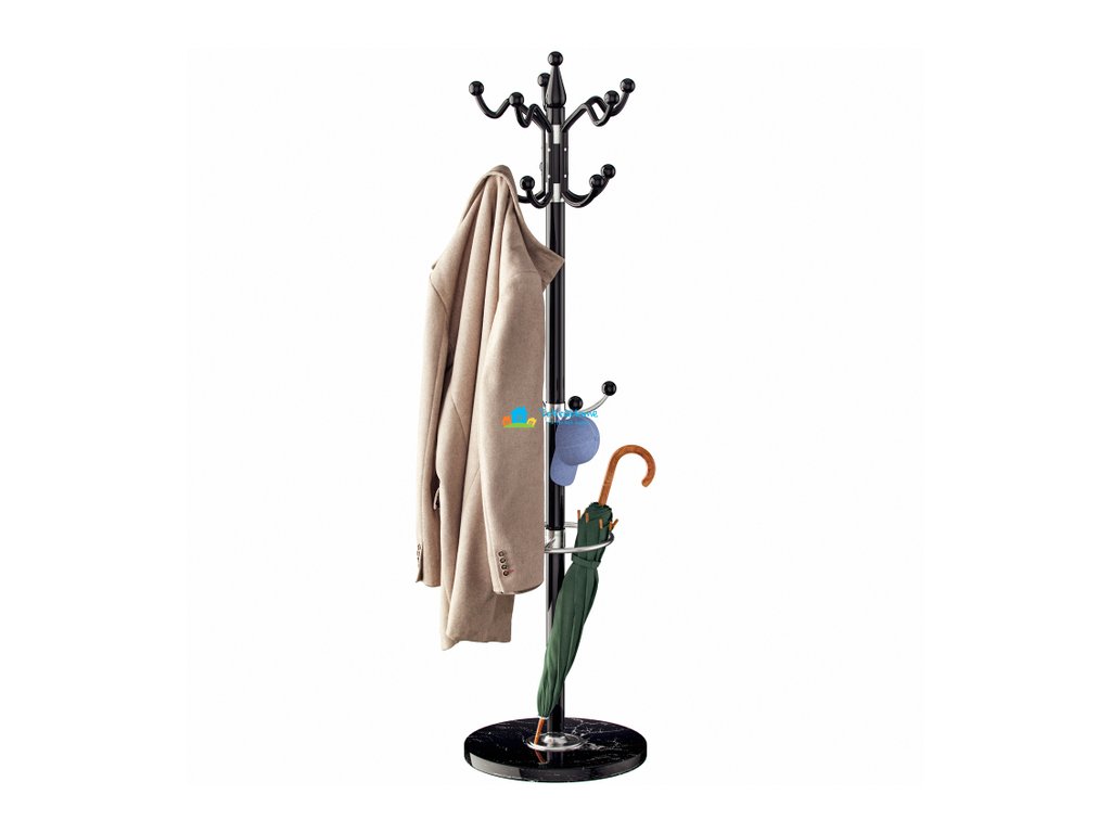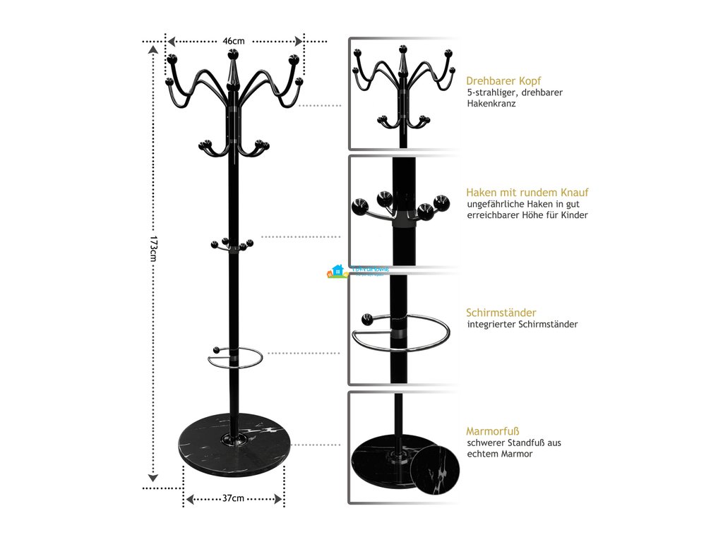 Věšák na šaty, robustní, mramorový podstavec, 14 háčků, otočný horní věnec, nosnost 35kg, moderní design, integrovaný stojan na deštníky, černý