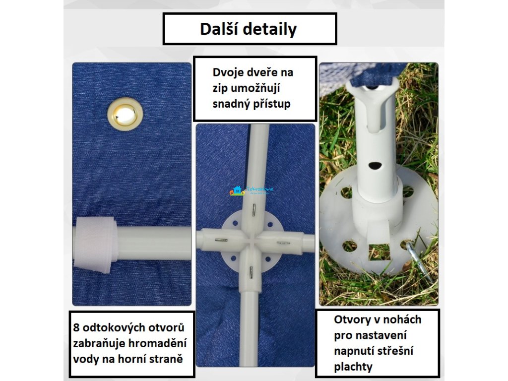 - Součástí balení je 8 kolíků a 4 napínací lana pro bezpečné ukotvení