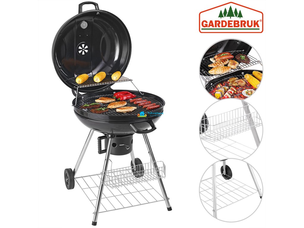 Mobilní gril na dřevěné uhlí na kolečkách Gardebruk má optimální výšku grilu, s větracím posuvníkem pro regulaci vzduchu, zásobník na popel, ohřívací rošt.
