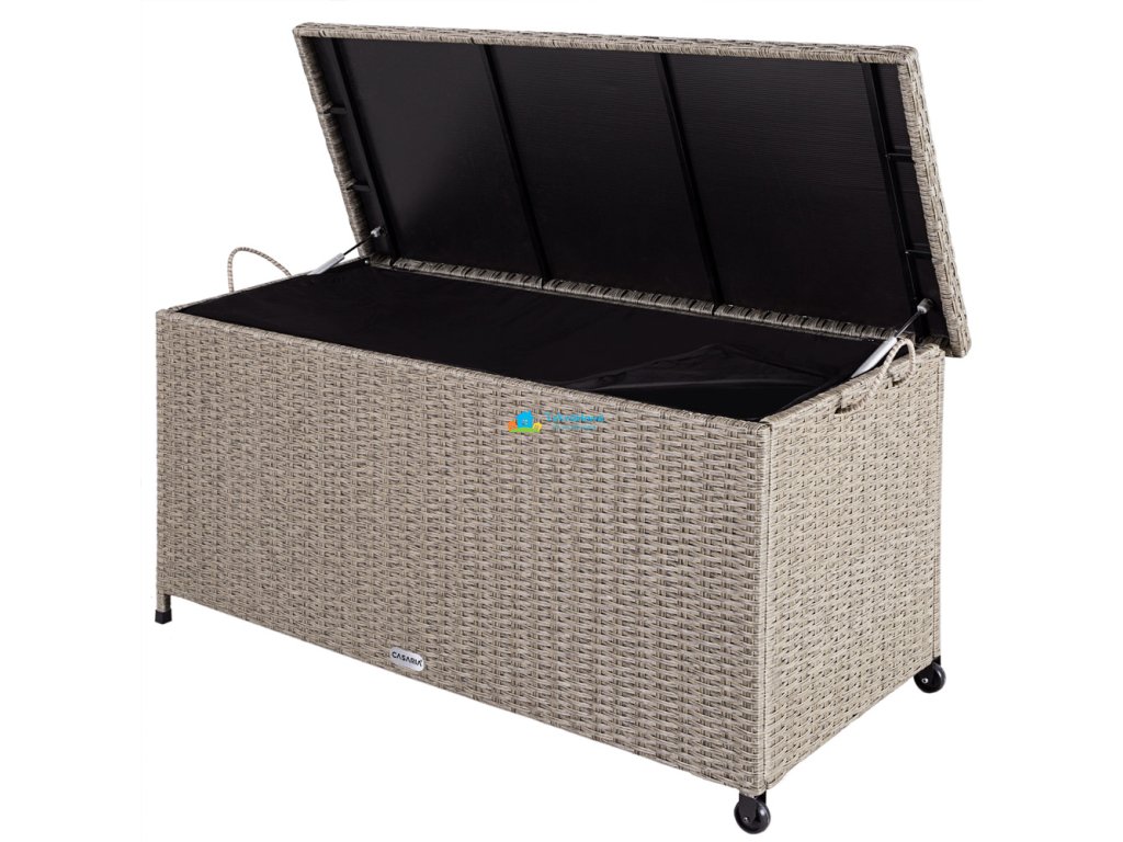 Robustní box vyrobený z polyratanu, který se snadno udržuje, nabízí dostatek prostoru pro podsedáky, polštáře, deky a další zahradní doplňky.
