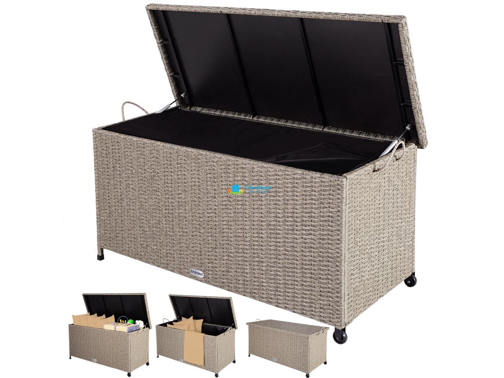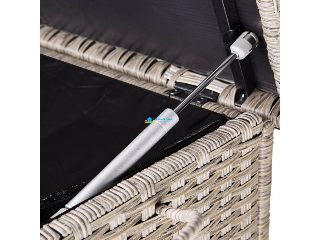 Stabilitu zajišťuje i víko truhly. Je vyztužena polykarbonátovými vícestěnnými deskami a lze ji snadno otevřít a zavřít díky automatickému zdvihu se 2 tlakovými plynovými pružinami. Celoobvodová okapová hrana navíc umožňuje odkapávání dešťové vody. Tím je zabráněno vnikání vody do zahradního úložného boxu otvorem/víkem. Se dvěma kolečky a dvěma držadly můžete úložný box snadno přesouvat. Chcete bezpečně uložit své podsedáky a polštáře? Naše zahradní úložný box poskytuje optimální ochranu proti vlhkosti a hmyzu. Polyesterová podšívka je voděodolná a je připevněna k vnitřní straně zahradní boxu suchým zipem. Výhodou je, že vnitřní podšívka se dá také rozepnout a zavřít na zip. Polyratan je velmi stabilní, rovnoměrně navinuté plastové vlákno, které bylo vyvinuto speciálně pro zahradní nábytek. Je odolný proti povětrnostním vlivům, UV záření, odpuzuje nečistoty a snadno se čistí. Ideální úložný prostor pro všechno!